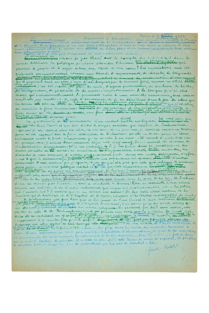 L.A.S. « André Breton » (minute), Paris 5 juillet 1935, au directeur de la Nouvelle Revue Française ; 1 page in-4 remplie d’une fine écriture à l’encre verte, bleue et noire avec de nombreuses ratures et corrections. Sur le suicide de René CREVEL. Brouillon très raturé et corrigé du droit de réponse de Breton, violemment mis en cause par Marcel JOUHANDEAU lors du suicide de René CREVEL (18 juin). Breton demande d’insérer ce texte dans la revue à la même place et dans les mêmes caractères.