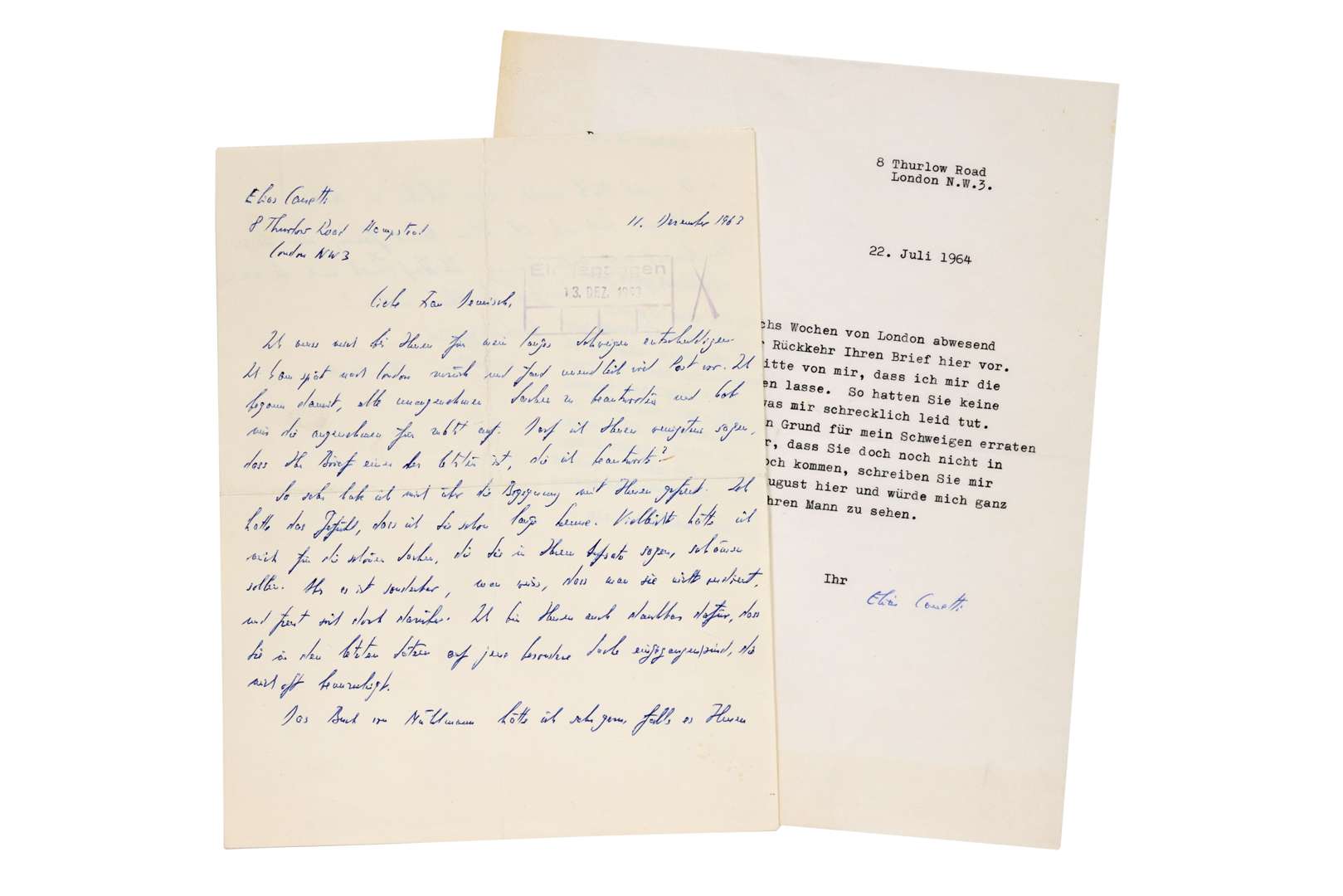L.A.S. et L.S. « Elias Canetti », Londres 11 décembre 1963 et 22 juillet 1964, à Eva-Maria DEMISCH, du Frankfurter Allgemeine Zeitung ; 1 page et demie petit in-4 et 1 page in-4 ; en allemand.