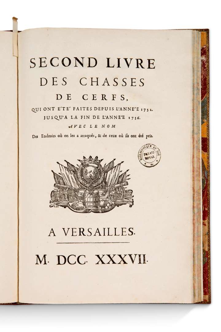 (PREMIER) LIVRE DE CHASSES DE CERFS qui ont été faites depuis l’année 1722 jusqu'à la fin de l’année 1731… [et] Second livre de chasses de cerfs qui ont été faites depuis l’année 1732 jusqu'à la fin de l’année 1736… A Versailles, 1732-1737. 2 volumes grand in-4, maroquin rouge de l’époque, dos à 6 nerfs, caissons richement ornés, double filet sur les plats dentelle épaisse encadrant les plats, roulette sur la chasse, le tout doré, dorure sur tranches marbrées. [1] f. (titre), 110 ff. (sans f. 6 et 15) + [1] f. (titre), 46 ff. Armes du duc du Maine en vignette au titre. Livre des chasses de cerfs menées de février 1722 jusqu'à décembre 1731 et de janvier 1732 jusqu'à décembre 1736, répertoriant les lieux où elles ont été attaquées et ceux où elles ont été prises. Bel exemplaire de la Bibliothèque du Roi Louis-Philippe, Palais Royal avec cachet au titre. Notre exemplaire est certainement celui cité par Thibaud et Dunoyer de Noirmont : “Tirés à un nombre très restreint d'exemplaires, pour distribution privée, ces deux volumes sont une des plus grandes raretés de la Bibliographie cynégétique. Le seul exemplaire qui soit jamais passé en vente publique est celui, relié en maroquin rouge de l'époque, qui a figuré à la vente du Duc de Vendôme, seconde partie, février 1932, n° 1249, où il fut adjugé 5.500 fr. — Dunoyer de Noirmont, I, 250, cite le même ex., qui faisait alors partie de la bibliothèque de la Reine Marie-Amélie” (Thiébaud, 1934). Très petits frottement et tâches à la reliure, légères rousseurs, des feuillets uniformément brunis, sans les feuilles 6 et 15 de la première partie, fautes de pagination dans la seconde partie les pages 15 à 20 numérotées : 3, 4, 3, 6, 18, 19.