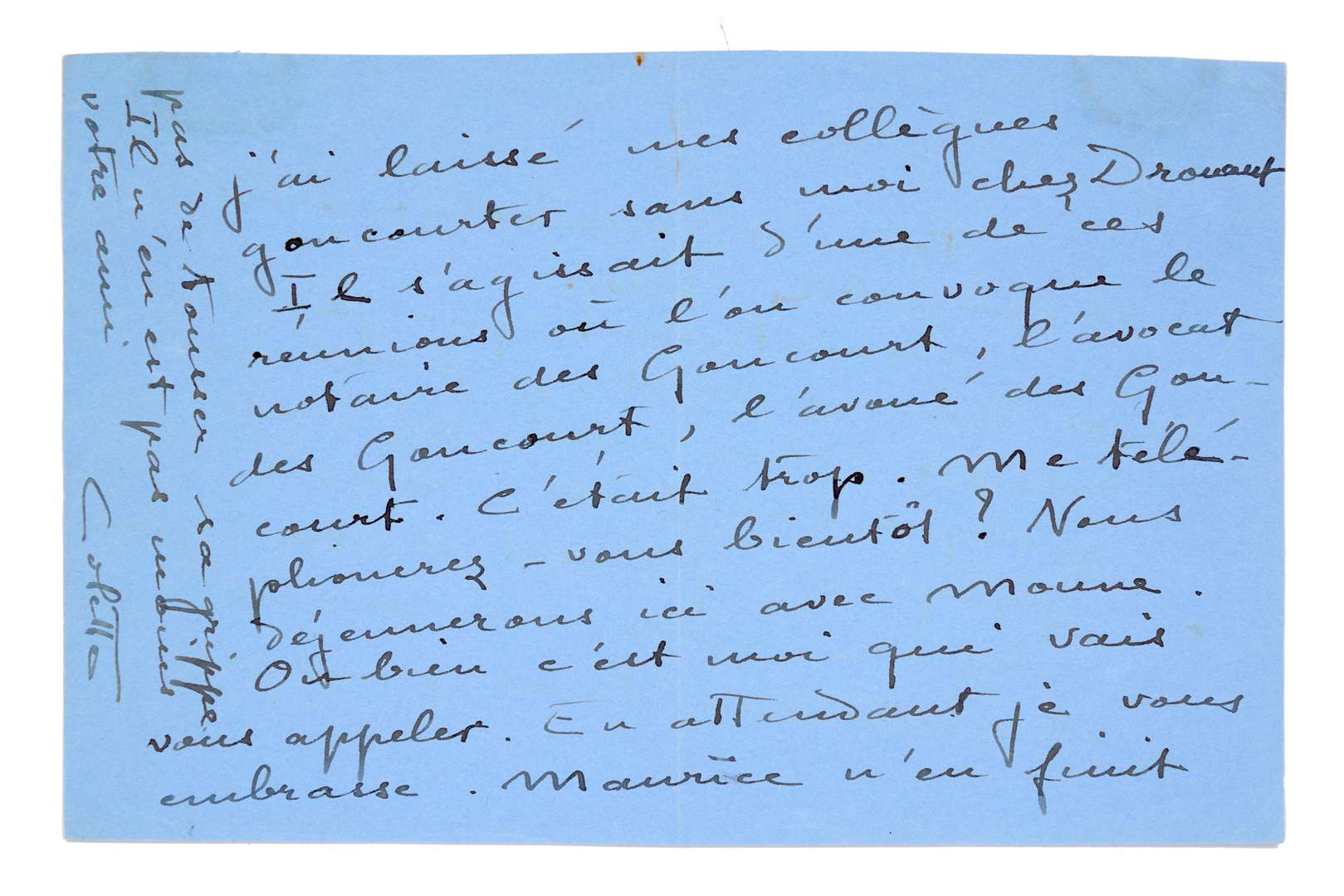 L.A.S. « Colette », [8 janvier 1947], à Maurice SAUREL ; 2 pages oblong in-8 sur papier bleu, enveloppe timbrée.