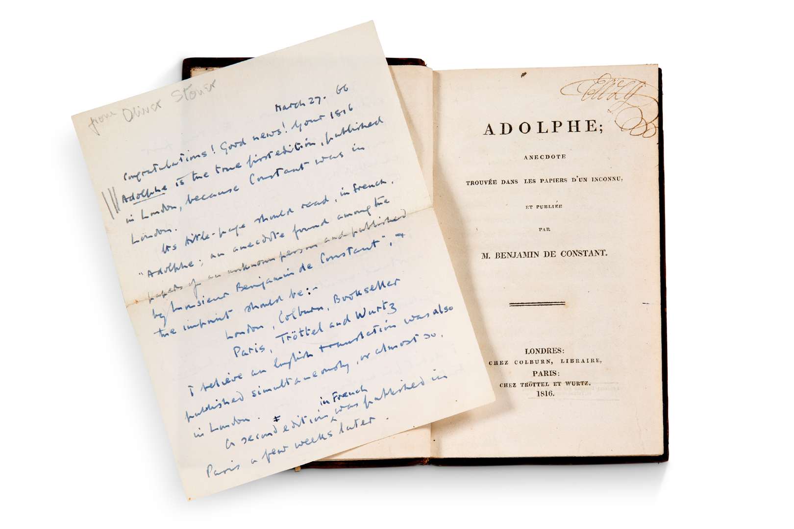Adolphe ; anecdote trouvée dans les papiers d’un inconnu, et publiée par M. Benjamin de Constant. Londres, Paris, chez Colburn, Tröttel et Wurtz, 1816. In-12, veau brun anglais de l’époque, dos lisse orné à froid, pièce de titre de maroquin vert, filet et roulettes à froid encadrant les plats avec chiffre E frappé à froid au centre, tranches jaspées. Sous étui cartonné postérieur. VII-228 pp. Rarissime “édition de Londres”, considérée comme la véritable originale publiée lors de l’exil de Benjamin Constant à Londres. Deux éditions ont paru en 1816, notre princeps publié simultanément à Londres et Paris ; la seconde publiée quelques semaines plus tard à Paris. “Peu d’exemplaires connus dans les bibliothèques publiques”. En français dans le texte, 225. “Adolphe est l’analyse aiguë du mal dont Constant était atteint, qu’il définit comme étant une inquiétude perpétuelle de l’amour, aggravée par l’impuissance d’aimer. Histoire d’une liaison, le roman est étroitement corrélé à la destinée sentimentale de l’auteur. Son génie de moraliste et psychologue fit le reste. La génération romantique y reconnut ses propres contradictions”. Exemplaire ayant appartenu à la princesse Elizabeth, fille de Georges III, avec son ex libris à la plume au titre et son chiffre à froid sur la reliure. Fille du roi d’Angleterre George III, la princesse Elizabeth (1770-1840) épousa tardivement Frederick VI, landgrave de Hesse-Hombourg, en 1818. Après son mariage, elle quitta l’Angleterre pour l’Allemagne où elle résida jusqu’à sa mort. Passé ensuite dans la bibliothèque du politique français Dominique de Villepin, avec son ex libris. Ouvrage rare et recherché dans toutes ses éditions. Exemplaire à belles marges, resté frais. Truffé d’une lettre MS en anglais d’Oliver Stouet, datée du “27 mars 1866 (1966)” au sujet du livre. Provenance : Bibliothèque Philippe de Villepin avec son ex libris en couleurs créé par l’artiste chinois contemporain Zao Wou Ki, contrecollé sur la première garde. Vente Feux et Flammes, Villepin I, Pierre Bergé 2013. Discrètes restaurations à la reliure (coiffes et coins), mors supérieur très légèrement fendu mais bon exemplaire.
