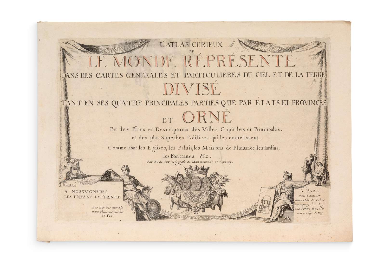 L’Atlas curieux ou Le Monde représenté dans les cartes générales et particulières du ciel et de la Terre divisé tant en ses quatre principales parties que par états et provinces… Paris, chez l’Auteur, dans l’Isle de Palais, sur la Quay de l’Orloge a la Sphere Royale, 1700.In-4 oblong (27,5 × 39,6 cm), [50] ff. : titre gravé, avertissement, titre-frontispice, 24 cartes et plans gravés en noir, rehaussés à l’époque de limites à l’aquarelle orange, et 23 ff. de texte. En feuilles, non relié. Première livraison (ou partie) de l’édition originale de L’Atlas curieux de Nicolas de Fer, publié en six livraisons entre 1700 et 1705. Atlas entièrement gravé sur cuivre, comprenant une page de titre gravée, un avertissement, un beau titre-frontispice représentant une bataille navale, 23 feuillets de texte et 24 cartes, plans ou vues, pour la plupart rehaussés à l’époque de limites à l’aquarelle orange. Toutes les cartes sont datées de 1700. Parmi les cartes présentes dans cette première livraison : une mappemonde en deux hémisphères, les cartes des continents (Europe, Asie, Afrique, Amériques), une carte de France, un plan général de Versailles, une vue de la Machine de Marly, ainsi que des plans de Londres, Bruxelles, Milan, Rome, Venise, etc. L’ensemble comprend également une « Carte de la Californie et du Nouveau-Mexique » montrant la Californie comme une grande île. Légères mouillures, restaurations sur quelques feuilles. Pastoureau, FER IA (pp. 170-172).
