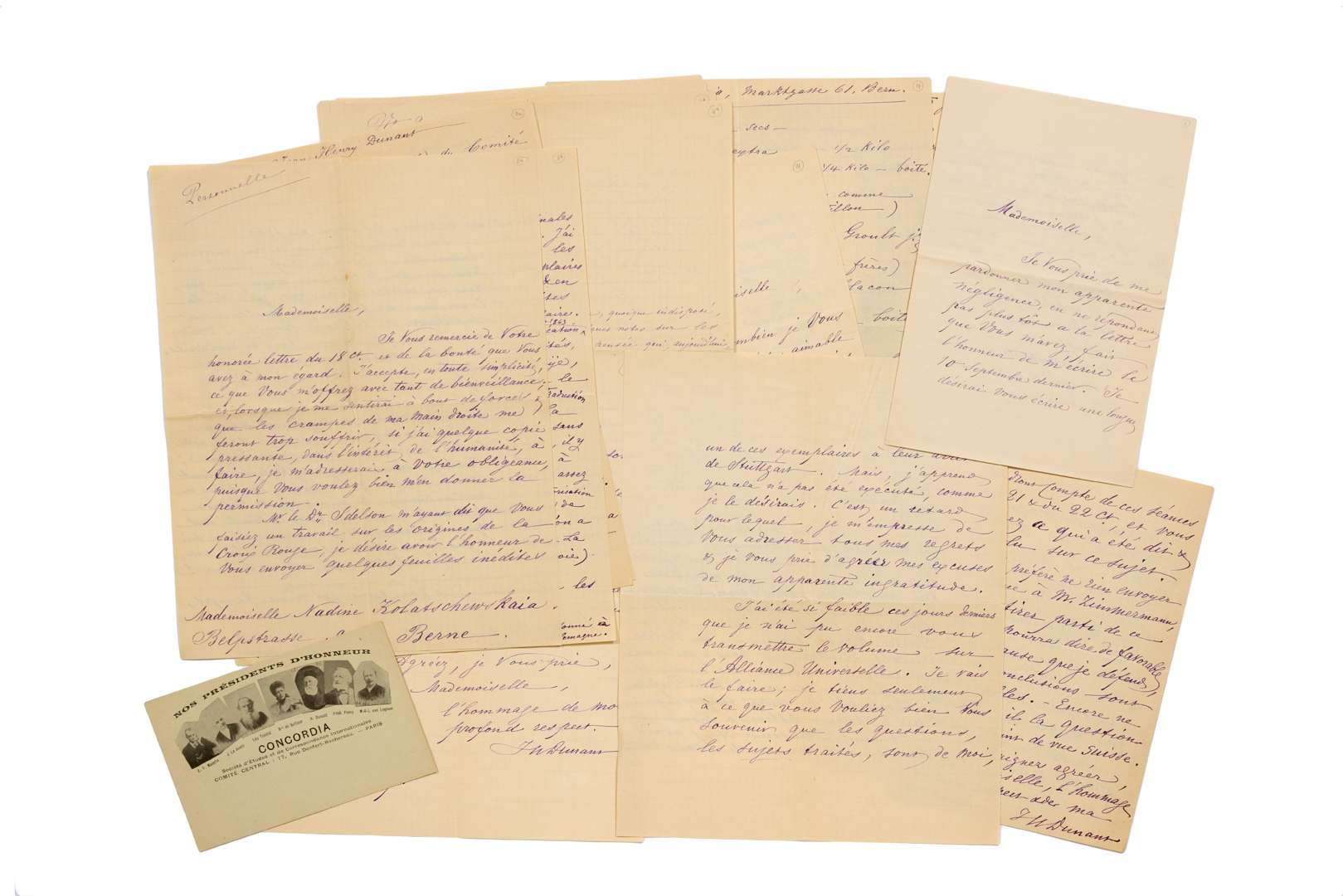 13 L.A.S. « J.H. Dunant » ou « H. Dunant », 2 L.A. et 3 P.A., 1896-1900, à Mlle Nadine KOLATSCHEVSKAIA à Berne ; 53 pages in-8 ou in-4, une enveloppe.