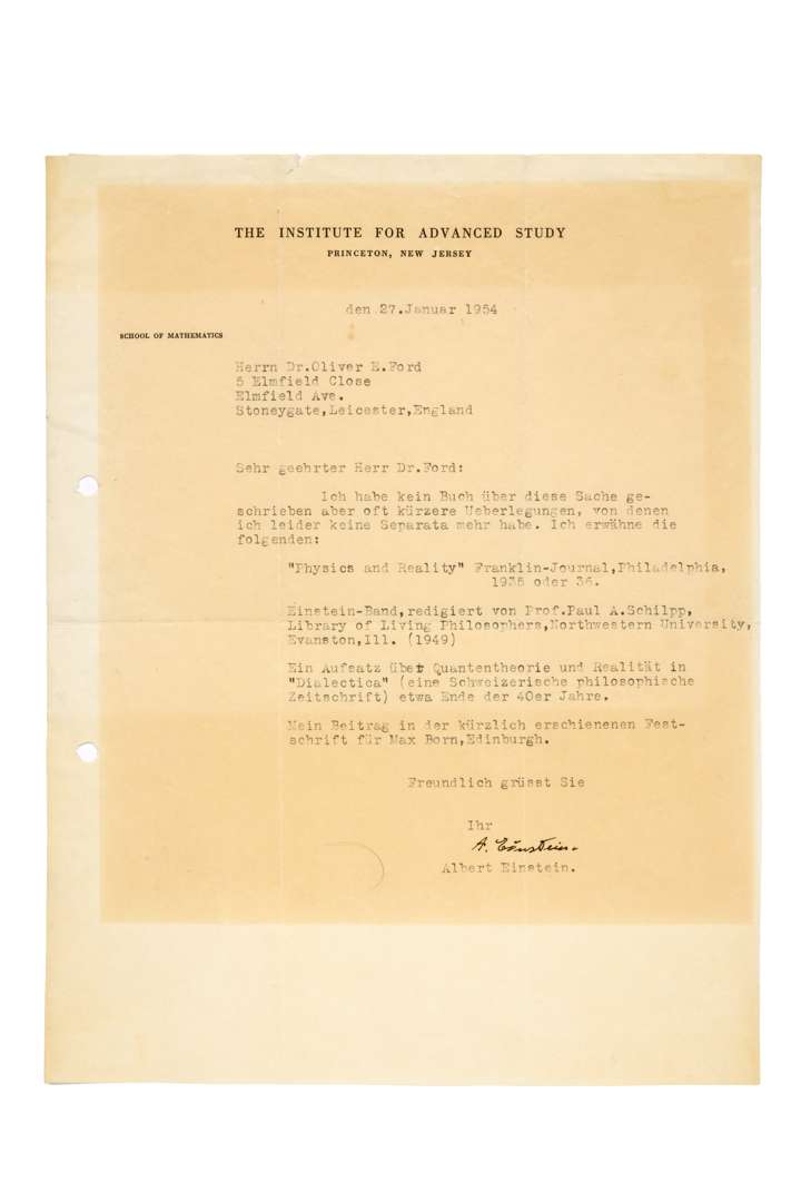 L.S. « A. Einstein », Princeton 27 janvier 1954, au Dr. Oliver E. FORD à Stoneygate (Angleterre) ; 1 page in-4 à en-tête The Institute for Advanced Study (trous de classeur marginaux, légère jaunissure partielle) ; en allemand.