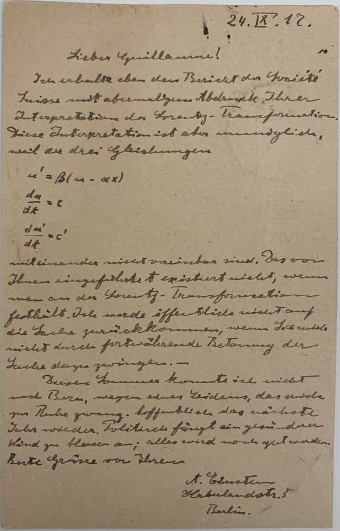 L.A.S. « A. Einstein », Berlin 24 novembre 1917, à Édouard GUILLAUME à Berne (Suisse) ; 1 page in-12 (Postkarte) avec adresse au verso ; en allemand.
