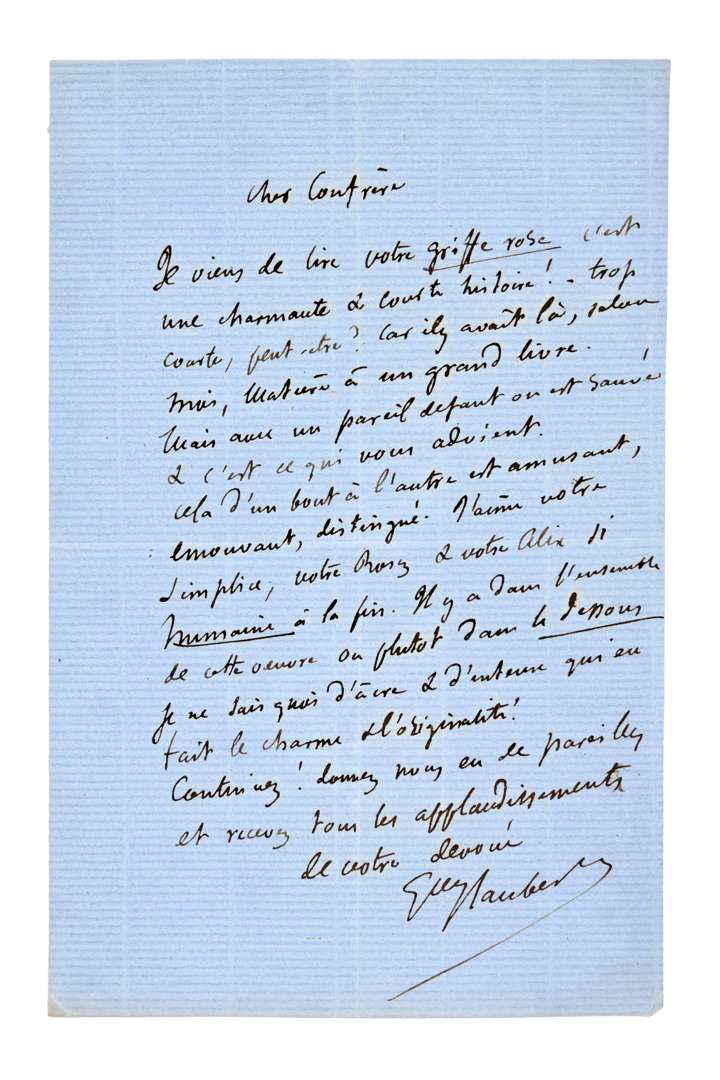 L.A.S. « Gve Flaubert », [Croisset vers le 25 juillet 1862], au poète Armand RENAUD ; 1 page in-8 sur papier bleu.