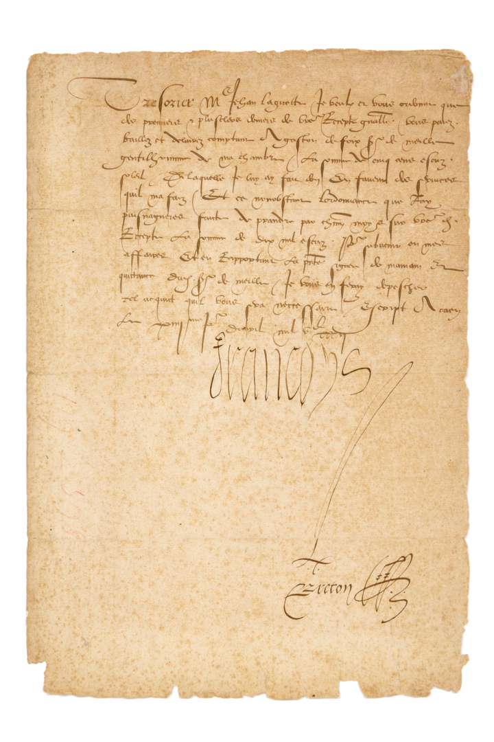 P.S. « Francoys », Caen 14 avril 1532 ; contresignée par son secrétaire des finances Jean BRETON (1490-1542) ; 1 page petit in-fol. (papier lég. bruni, un peu effrangé dans le bas).