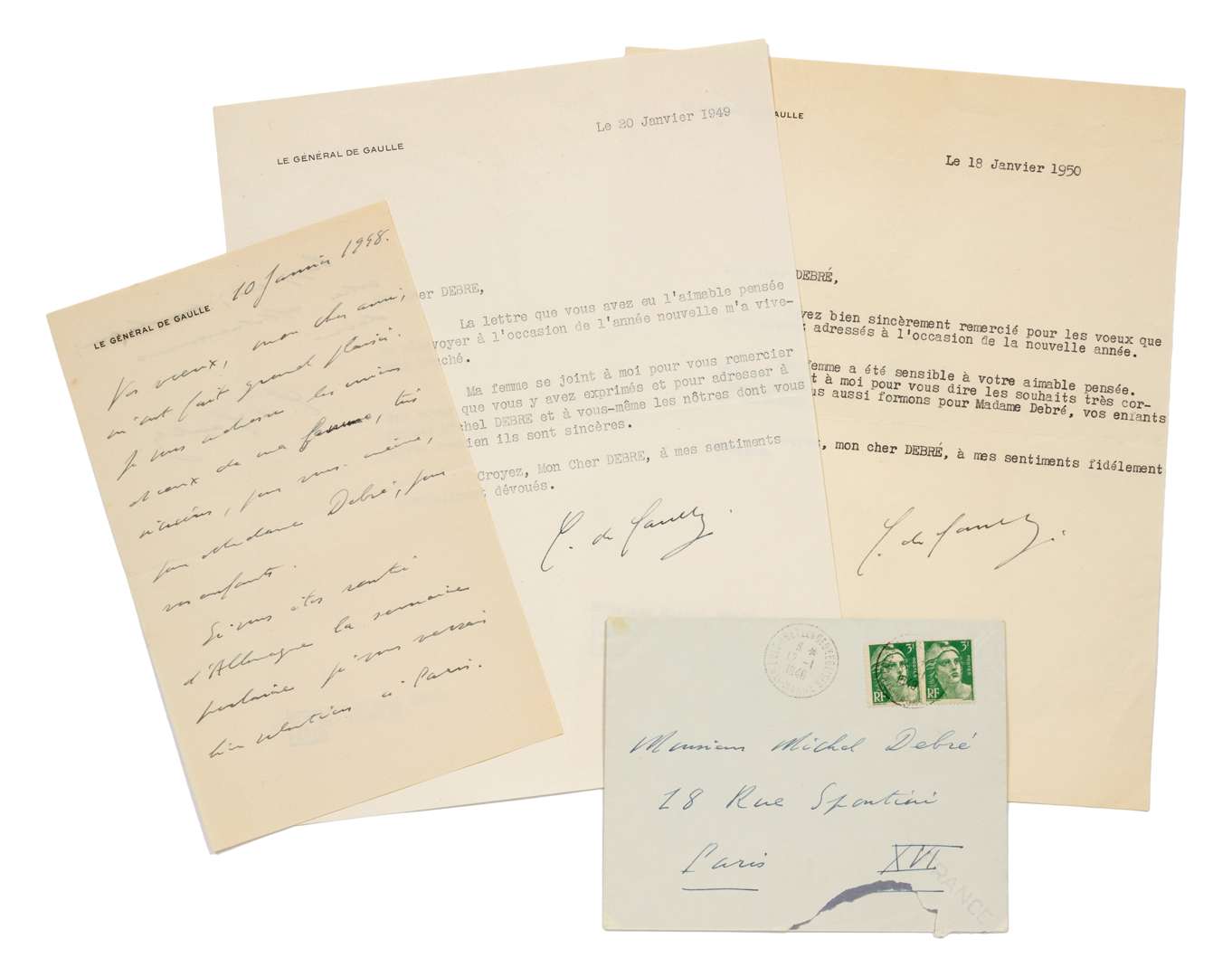 On joint 2 L.S. « C. de Gaulle », à Michel DEBRÉ, 20 janvier 1949 et 18 janvier 1950 (1 p. in-4 dactyl. chaque à son en-tête, une enveloppe). Vœux amicaux de nouvel an.