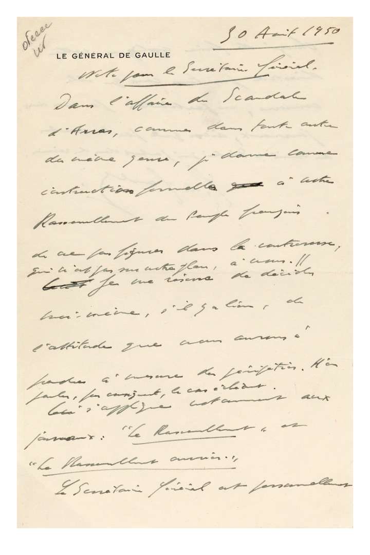 L.A.S. « C. de Gaulle », 30 avril 1950, [à Jacques SOUSTELLE] ; 1 page et demie in-8 à son en-tête Le Général de Gaulle.