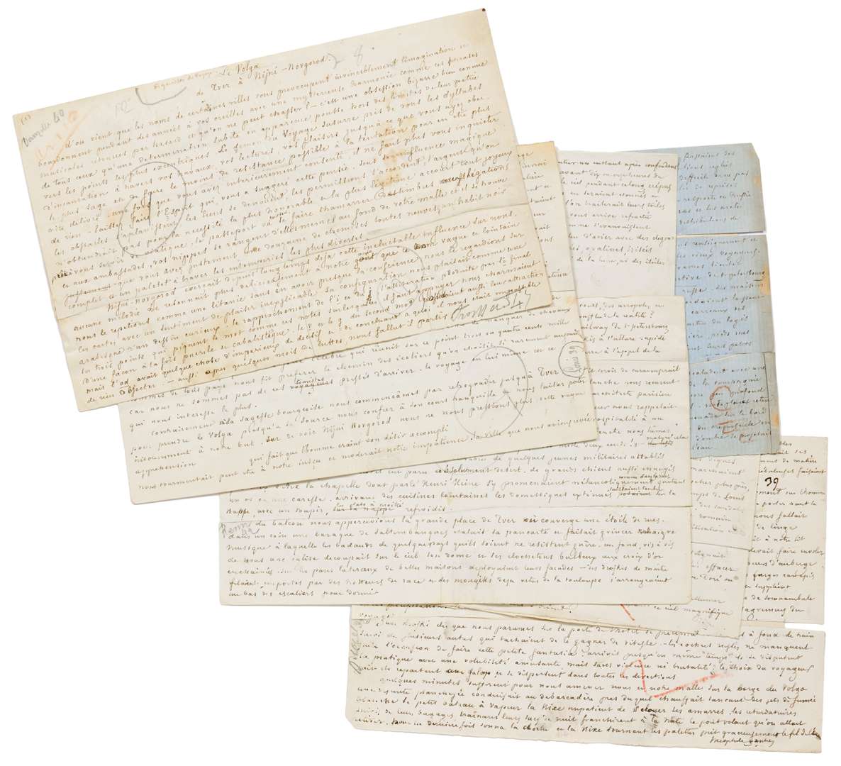 MANUSCRIT autographe signé « Théophile Gautier », Esquisses de voyage. Le Volga de Tver à Nijni-Novgorod, [1861] ; 7 pages oblong in-8, découpées pour l’impression puis remontées.