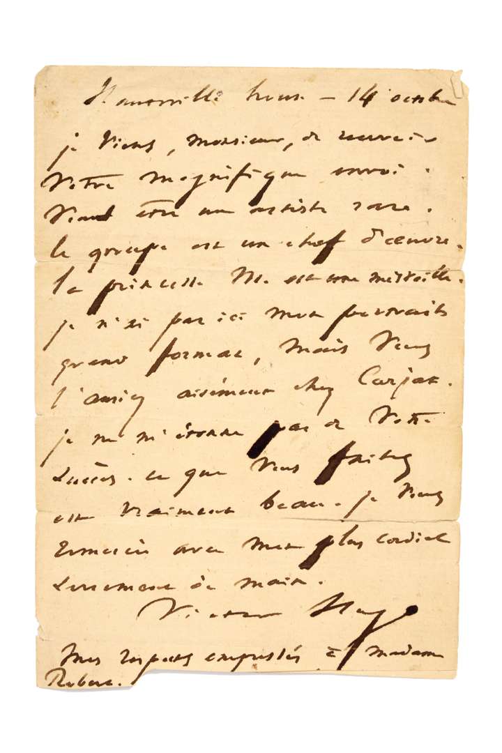 L.A.S. « Victor Hugo », Hauteville house 14 octobre [1872, à Émile ROBERT] ; 1 page in-8 (fente à un pli, petite découpure dans le papier en bas).