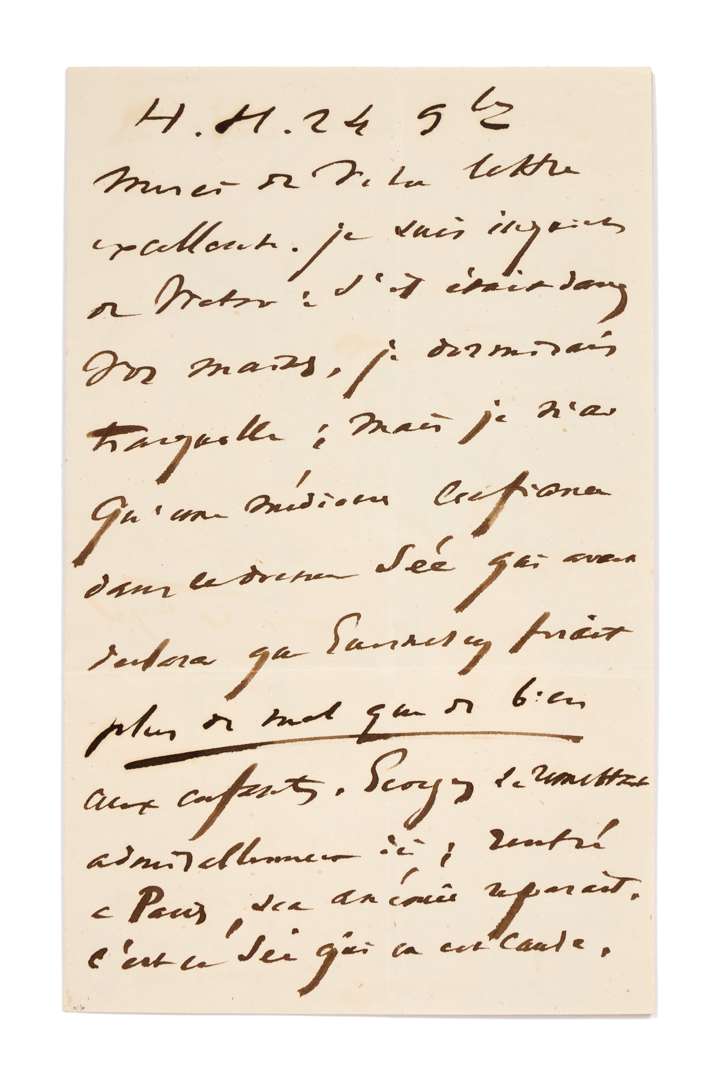 Il est inquiet pour son fils Victor : « s’il était dans vos mains, je dormirais tranquille ; mais je n’ai qu’une médiocre confiance dans le docteur Sée qui avait déclaré que Guernesey ferait plus de mal que de bien aux enfants. Georges se remettait admirablement ici ; rentré à Paris, son anémie reparaît. C’est ce Sée qui en est cause. De même pour Victor. Je me figure qu’ici, et avec vous pour médecin, il guérirait vite. Cher docteur, cher ami, vous êtes bon et charmant de me renseigner dans ma solitude. Ce que vous me dites des petits nous a enchantés. Si j’apprenais que l’hématurie de Victor a cessé, je prendrais tout en patience et même en joie. Je travaille. Madame Drouet vous embrasse. Nous vous regrettons et nous vous aimons »...