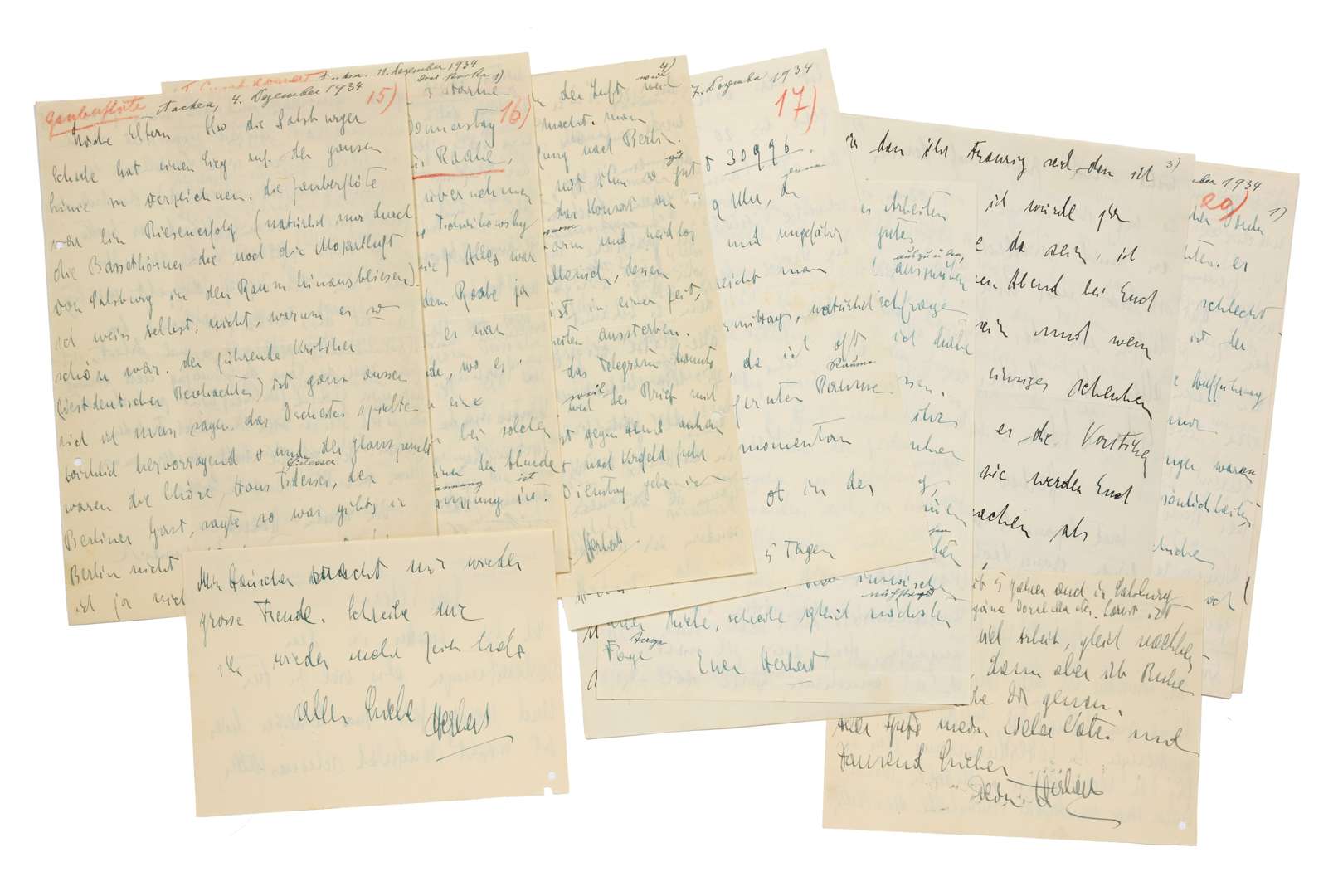 9 L.A.S. « Herbert », Aachen 1934-1936, à ses parents ; 20 pages in-4 et 4 pages oblong in-8, 3 à en-tête Der Generalmusikdirektor der Stadt Aachen ; en allemand (trous de classeur).