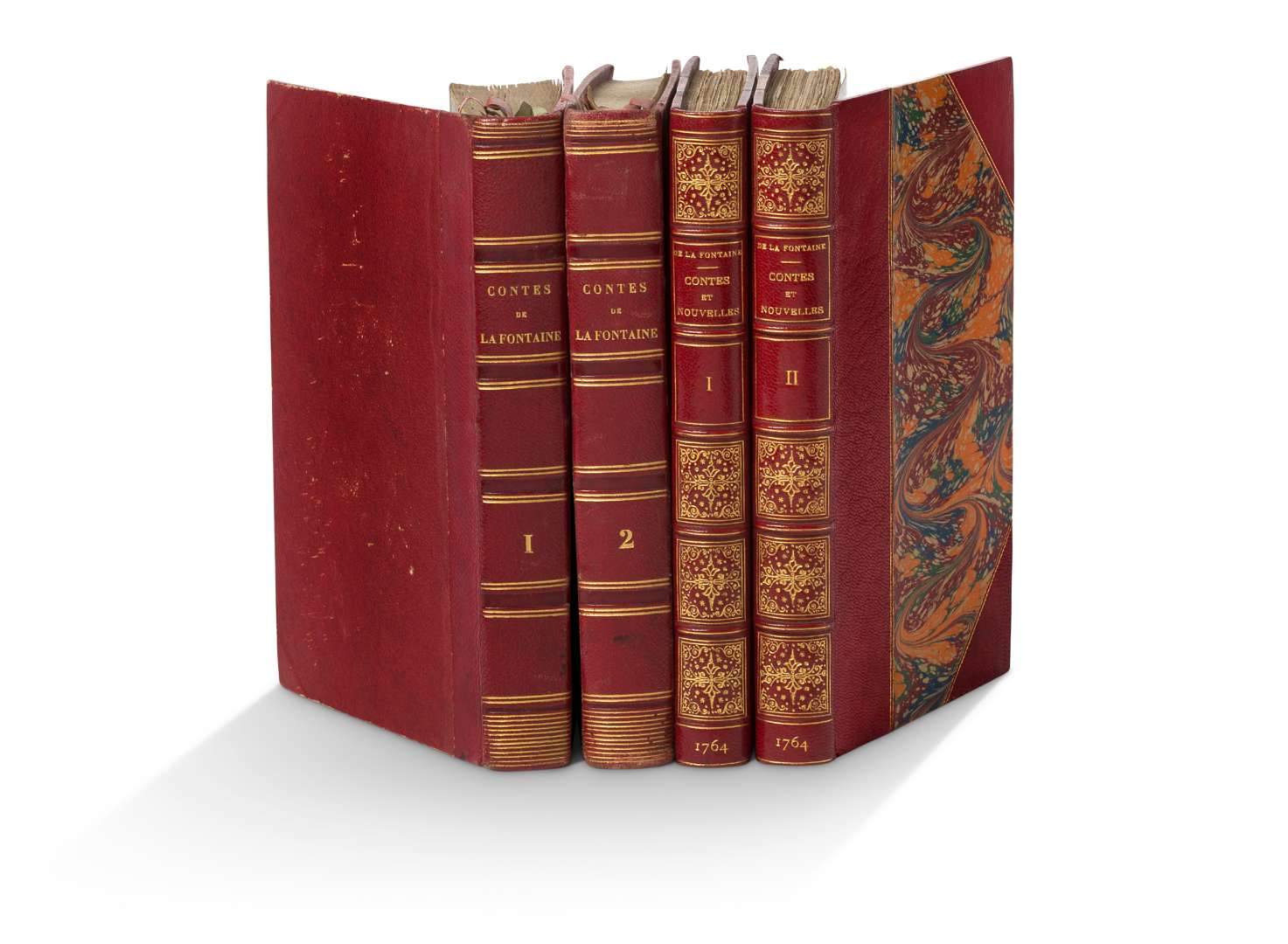 Lot de 2 éditions anciennes illustrées des Contes et nouvelles en vers. -A Paris, Chalon, An 2 Reliure postérieure rouge In-12, demi chagrin rouge du XIXe, dos lisse orné de larges filets à froid et double filets dorés, titre et tomaison dorés. Gravures en noir,.Avec le portrait frontispice. Suites de figures dites “des Fermiers généraux”. Qques rousseurs et frottements. -Amsterdam, 1764. In 12, demi maroquin rouge à coins du XIXe, dos à nerfs orné, double filet doré sur les plats, Avec le portrait-frontispice. Bel exemplaire.