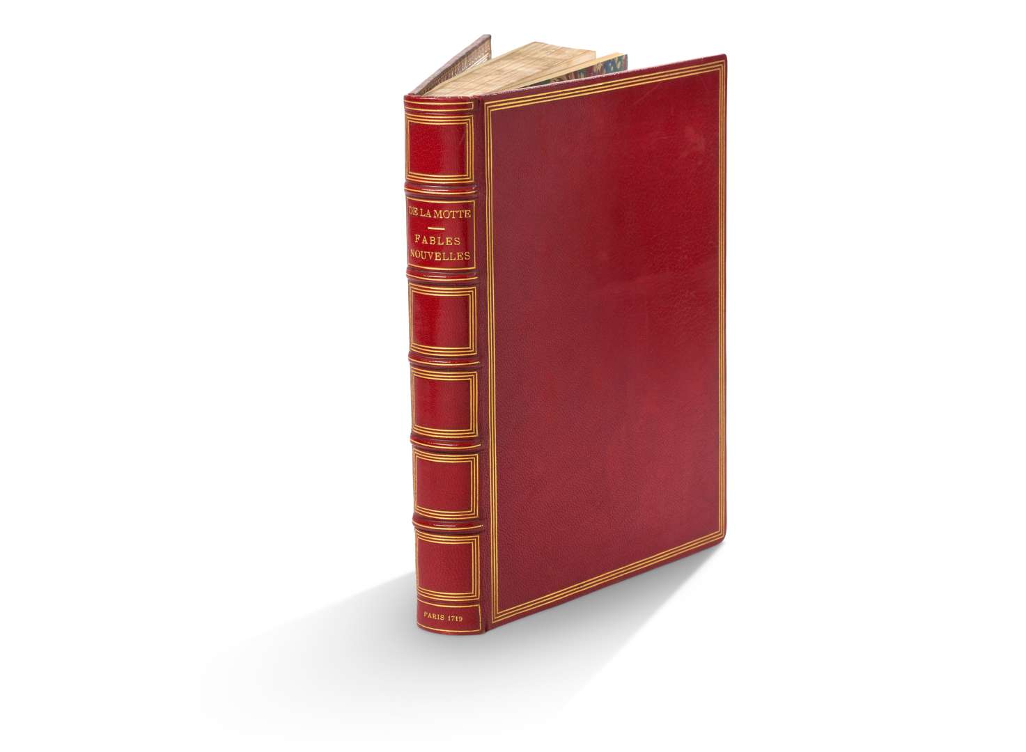 Fables nouvelles, dédiées au Roy. Avec un discours sur la fable. A Paris, chez Grégoire Dupuis, 1719. In-4 (25 x 19 cm). XLII-358 pp., [3 ff.]. Fautes de pagination pp. 121-129 numérotées 131-139. Maroquin rouge moderne, dos à 5 nerfs saillants, auteur et titre dorés, lieu et date frappés en queue de dos, triple filet encadrant les caissons et les plats, double filet sur les coupes et les coiffes, dentelle sur les chasses, le tout doré, tranches dorées [Bonleu]. Édition originale. "Très belle édition rare et recherchée” (Cohen). "Premier Livre illustré au XVIIIe siècle”, Trésors des bibliothèques de France, II, 1-14. Illustré dans le style rocaille d’un frontispice gravé en noir par Tardieu d'après Coypel, d’une vignette de titre gravée par Simonneau d'après Vleughels et de 100 vignettes gravées sur cuivre en tête des fables d’après Gillot, Coypel PIcart, Edelincl, gravées par Cochin…. Provenance: ex-libris ancien Caroli De Recicourt (manuscrit au titre). Cohen, 954-956. Légers frottements au plat supérieur et discrètes griffures au plat inf., rousseurs très discrètes, feuillet de table uniformément brunis.