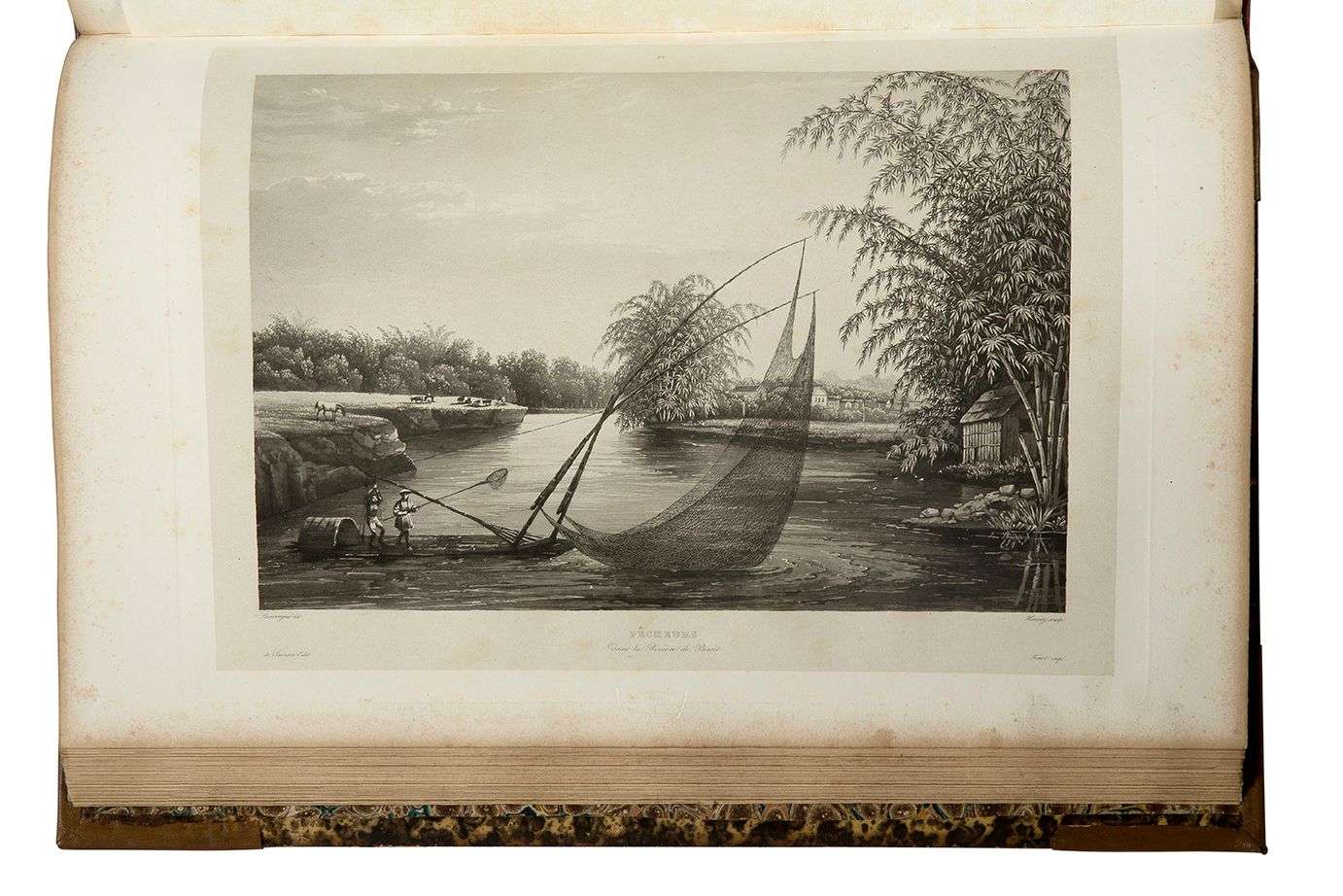 Voyage autour du monde par les mers de l'Inde et de la Chine exécuté sur la corvette de l'État la Favorite pendant les années 1830, 1831, 1832… Paris, Imprimerie Royale, Arthus Bertrand, au Dépôt général de la Marine, 1833-1839. Ensemble de 8 volumes soit 4 volumes de texte au format in-8, un volume in-8 de texte et planches zoologiques, un volume de planches en manière noire au format in-folio et un volume de cartes au format in-plano. Édition originale. La seule ancienne. Exceptionnel aussi complet, les 3 Atlas et Album ne se rencontrent que rarement à la vente. Important récit du voyage maritime de circumnavigation du capitaine Théodore Laplace (1793-1875), explorateur français parti depuis Toulon vers le Pacifique sur ordre du Gouvernement français en 1829. Le livre et ses belles illustrations ou vues en nuances mezzotinto de gris embarque le lecteur avec l’officier, de Gibraltar et Gorée via le Cap de Bonne-Espérance, puis, cabotant sur l’Océan Indien, prend la route des Indes via les Seychelles, Ceylan, Pondichéry… jusqu’à atteindre la Chine et le Viet-Nam. - TEXTE. 4 volumes , 1833-1835, avec une carte dépliante. Demi-basane fauve de l’époque, dos à nerfs, pièces de titre (reliures reteintées, pièces de titre grossièrement restaurées, des rousseurs). - ENTOMOLOGIE. Le volume tome 5 est un Atlas paru en 1839. In-8 carré, demi-basane fauve moderne, dos à nerfs, pièces de titre. Souvent manquant. Composé de la version presque similaire des pages et planches publiées dans le Magasin de Zoologie en 1838, précédée d'une reproduction de la page de titre de 1839. Illustré de 22 très belles planches gravées et finement mises en couleurs à l’époque avec parfois rehauts de gomme, principalement d'insectes ou crustacés, et son supplément consacré aux lépidoptères (papillons), illustré de 10 planches gravées et mises en couleurs avec rehauts. Mors supérieur légèrement frotté mais sinon bel exemplaire. - ALBUM historique. 1835. In-folio, demi-basane fauve à coins moderne peu habile, dos à 5 nerfs, auteur et titre dorés. Reliure signée “Golfier”. [2] ff. (titre, table des planches), 72 planches gravées en taille-douce [manière noire] en nuances de gris par Himely, tirées sur Chine appliqué d’après les dessins de Barthélémy Lauvergne, peintre de la Marine, de Pâris et de Louis-Auguste de Sainson, dessinateur du voyage de l’Astrolabe, sous la direction duquel l’édition fut faite (rousseurs au texte, brunissures sans gravité en marge des planches). Reliure signée “Golfier”. - ATLAS hydrographique. 1833. In-plano, demi-basane havane à coins moderne et malhabile, dos moucheté, pièce de titre. [2] ff. (titre et table des cartes gravés), 12 cartes gravées sur acier en noir par Ambroise Tardieu, sur 11 ff. (accrocs et réparations aux coupes ; f. de table dérelié, poussière au titre et en marge de la pl.1, auréoles claires et brunissures en marges, rousseurs ; petite déch. sans manque à la pl.10). Provenance : Bibliothèque de l'entomologiste Jacques d'Aguilar (1921-2018), avec son bel ex-libris, gravé en noir et numéroté 78/200 et signé par l’artiste et graveuse Jeanne Esmein (1928-2025). Contrecollé au tome 5.