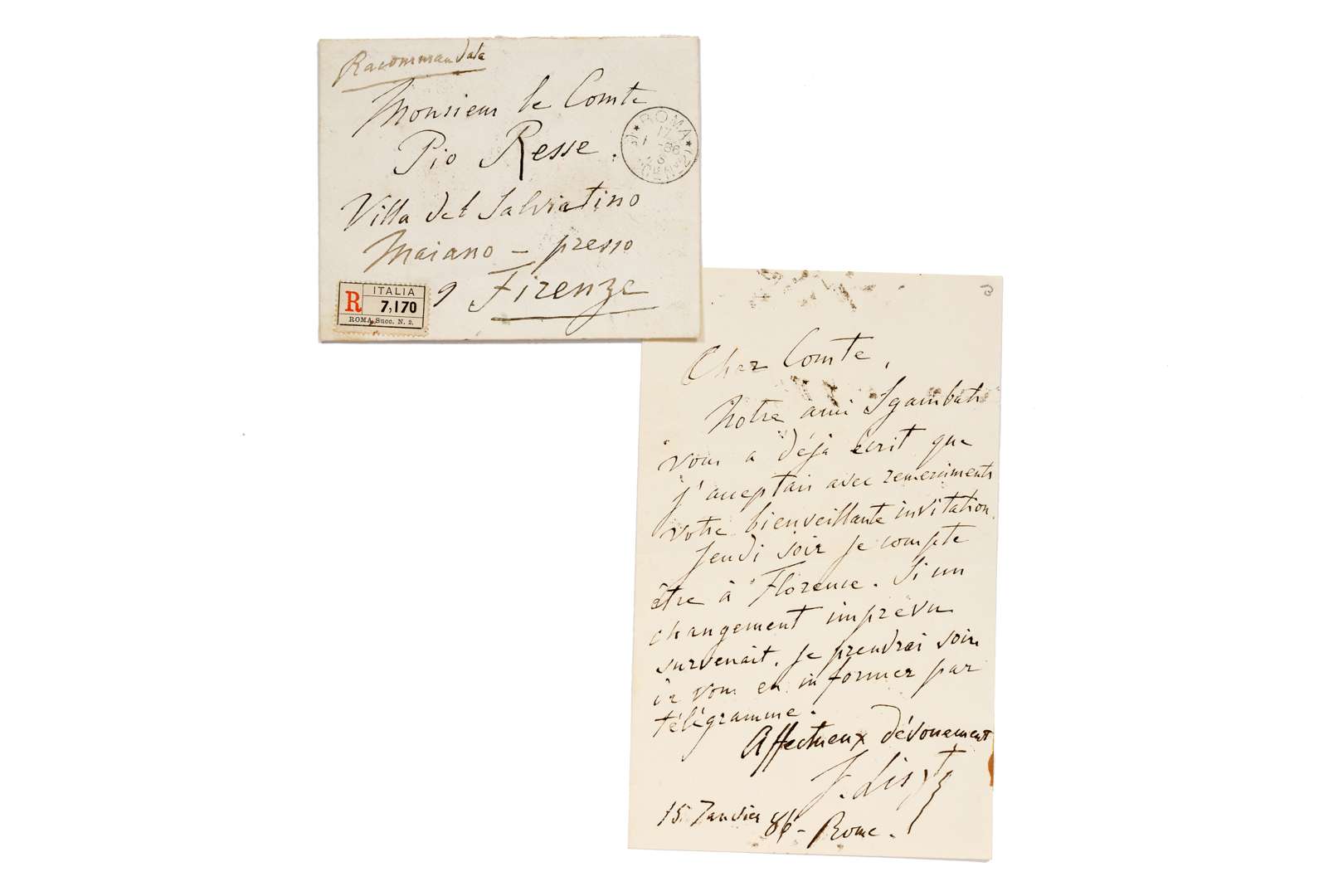 L.A.S. « F. Liszt », Rome 15 janvier 1886, au Comte Pio RESSE, Villa del Salviatino à Maiano près Florence ; 1 page in-8, enveloppe.