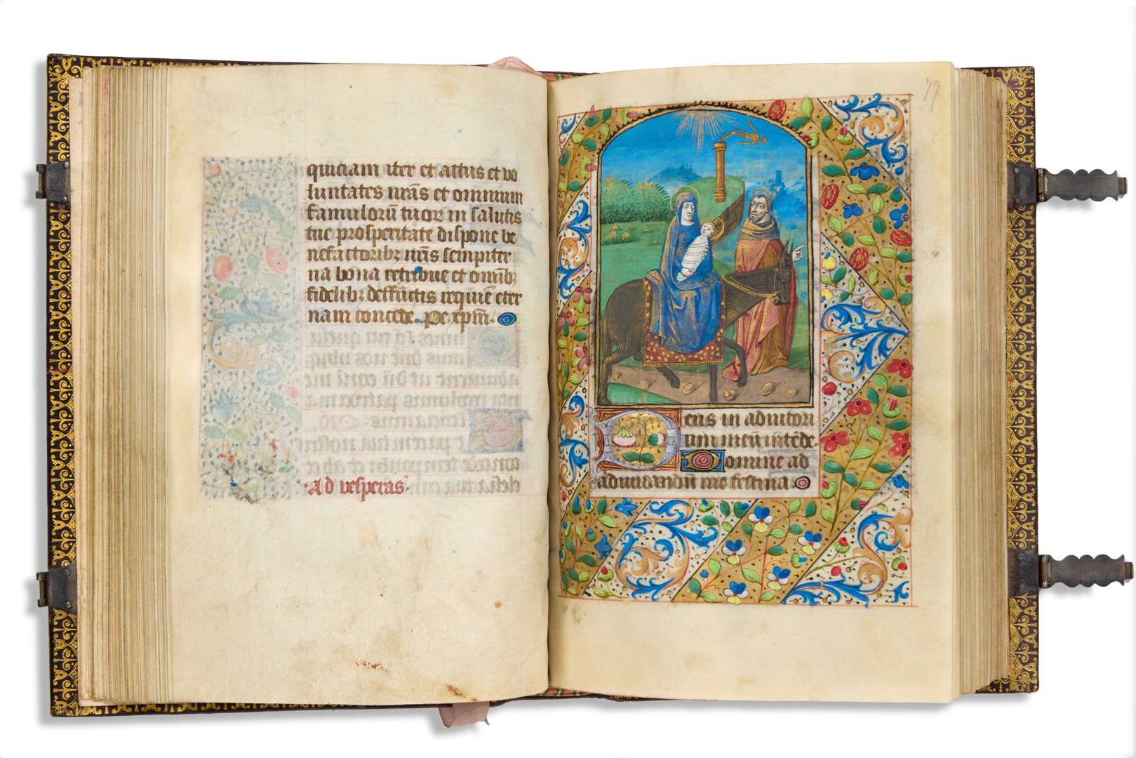 Livre d’heures, usage de Rome, enluminé par un disciple du Maître de Jacques de Besançon 13-148 157 (8-1) Manuscrit sur parchemin, France, vers. 1480-1500. Volume : En-8, 177 x 124 mm. 177 (de 178) feuillets. Collation: iv + 112 , 2-58 , 66 , 7-118 , 125 (4+1) , , , 16-228 , 233 (4-1 blank ) + iv. Foliation modern des crayons. – Surface d’écriture : 95 x 65mm. Une colonne de 16 lignes, réglée en rouge. Écrit à l’encre marron foncé en écriture Textura gothique ; Calendrier en rouge, bleu, et en or ; rubriques en rouge ; majuscules touchées en jaune. – Des centaines d’initiales de 1 à 2 lignes ornées de feuilles d’or, remplies et bordées de bleu et de rouge foncé alternés, des terminaisons de lignes au même palette ; Des dizaines d’initiales de 2-à-3 lignes en grisaille sur une base d’or liquide et rempli avec des fleurs, feuilles, et fruits et aux cadres de rouge avec filigrane en or ; 31 miniatures dont 19 petites (de 6 lignes) et 12 grande (1/2 page). Feuilles ornées de grandes miniatures dans des bordures pleines et feuilles ornées de petites miniatures dans des bordures aux trois quarts. Bordures composées de formes géométriques alternées d'or liquide avec fruits et fleurs ou d'acanthe tourbillonnante d'or liquide et de bleu avec des besants audacieux brunis. – Tout le volume, en outre, est en parfait état de conservation, à l'exception du f. 116 avec une petite déchirure dans le parchemin au niveau de la gouttière et quelques rares taches brunes ; la première feuille des Heures de la Croix a été retirée entre les ff. 113-114 et une plus grande tache brune dans la marge inférieure des ff. 80-82. – Maroquin violet à longs grains, dos et plats ornés à froid, milieux, doubles gardes de moire rouge, dentelle intérieure, tranches dorées, fermoirs (Simier). Ce superbe manuscrit de la seconde moitié du XVe siècle possède un texte richement enluminé de trente-et-une miniatures, aussi gracieuses que délicates, dues à l’habile pinceau d’un artiste de l’École parisienne, émule du célèbre Jacques de Besançon. Provenance 1. 2. 3. France, Galoys: Le manuscrit a appartenu, dans la seconde moitié du XVIe siècle, à un membre de la famille Galoys, laquelle a inscrit, sur le verso du dernier feuillet, le memento de plusieurs événements familiaux. France, Vente Massicot, 17 decembre 1903, no. 455 France, Catalogue Durel (jan. 1905), no. 395 ; vendu janvier 1906 Texte - ff. 1-12 : Calendrier richement ornés, sur leur recto, d’une charmante bordure formée d’un léger rinceau où l’or se mêle agréablement à la couleur ; les saints en or comprise : (jan.) Fabian & Sebastien, Vincent, Conversion de St. Paul ; (fev.) Purification de la Vierge, Cathedra de St. Pierre, Matthias ; (mar.) Marc ; (mai) Philippe & Jacob, Jean à la Porte Latin ; (juin) Barnabe, Nativité de St. Jean, Pierre & Paul apôtres ; (juil.) Margueritte, Marie Magdalen, Jacob, Anne ; (aout) Pierre advincula, Stephane, Laurence, Assumption de la Vierge, Bartholomew, Decapitation de Jean le Baptiste ; (sept.) Nativité de la Vierge, Matthieu, Michel Archange ; (oct.) Luc, Simon & Jude ; (nov.) Martin, Catherine, André ; (dec.) Nicolas, Conception de la Vierge, Thomas, Nativité de Dieu, Stephan, Jean, Thomas ; (ff. 13-18v) Extraits des Évangiles ; (ff. 19-22v) Obsecro te, en utilisant la forme masculine pour « famulo tuo » ; ; (ff. 22v-25) O intemerata, en utilisant la forme masculine pour « peccatori » ; (f. 25v) blanc ; (ff. 26-95) Heures de la Vierge : (ff. 26-46v) Matines ; (ff. 47-58) Laudes ; (ff. 59-63) Prime ; (ff. 63v-67v) Tierce ; (ff. 68-72) Sexte ; (ff. 72v-76v) None ; (ff. 77-84) Vêpres ; (ff. 84v-95) Complies ; (ff. 95v) blanc ; (ff. 96-108v) Psaumes pénitentiels ; (ff. 108v-113v) Litanies ; (ff. 114-123) Heures de la Croix et Heures du Saint-Esprit combinées et abrégées : (f. 114) Matines ; (ff. 122v-123) Complies ; (ff. 124-167) Heures des Morts : (f. 124) Vêpres ; (ff. 167v-176v) Suffrages des Saints : (f. 167v) St. Michel ; (f. 168) St. Jean-Baptiste ; (f. 168v) St. Jean Évangéliste ; (f. 169) St. Jacques ; (f. 169v) St. Christophe ; (f. 171) St. Antoine ; (f. 171v) St. Sébastien ; (f. 173) St. Laurent ; (f. 173v) Ste. Denise Anty ; (f. 174) St. Étienne ; (f. 174v) Ste. Catherine ; (f. 175) Ste. Barbe ; (f. 176) Ste. Marguerite ; (f. 176v) Ste. Geneviève. ENLUMINURE Le Maitre de Jacques de Besançon (fl. 1480-1498) était un enlumineur parisien à la fin du 15e siècle et était parmi les plus demandés de son époque. Son style a inspiré de nombreux artistes, comme celui que l'on retrouve à l'œuvre dans le présent manuscrit. Le Maitre de Jacques de Besançon a travaillé pour les commissions de luxe pour les bibliophiles royales ainsi que les œuvres fait pour le marché. Notre artiste travaille dans le style de ce maître, mais avec une finesse un peu moindre. De belles et larges bordures, aux rinceaux de nuances chatoyantes, encadrent et accompagnent toutes ces compositions. Le texte, enrichi de nombreuses fins de lignes et d’initiales rubriquées, fait de ce volume un Livre d’Heures parisien remarquable et très artistique. Miniatures 1. f. 13 Grande miniature : St. Jean dans l’île de Patmos écrivant son Évangile 2. f. 15 3. f. 16v 4. f. 18 5. f. 19 6. f. 22v 7. f. 27 8. f. 47 9. f. 59 10 f. 63v 11. f. 68 12. f. 72v 13. f. 77 14. f. 84v 15. f. 96 16. f. 119 St. Luc St. Mathieu St. Marc la Vierge à l’Enfant la Pietà Grande miniature : l’Annonciation à la Vierge Grande miniature : la Visitation Grande miniature : la Nativité Grande miniature : l’Annonciation aux bergers Grande miniature : l’Adoration des rois Mages Grande miniature : la Présentation au temple Grande miniature : la Fuite en Égypte Grande miniature : le Couronnement de la Vierge Grande miniature : le roi David Grande miniature : la Pentecôte 17. f. 124 18. f. 167v 19. f. 168 20. f. 168v 21. f. 169 22. f. 169v 23. f. 171 24.