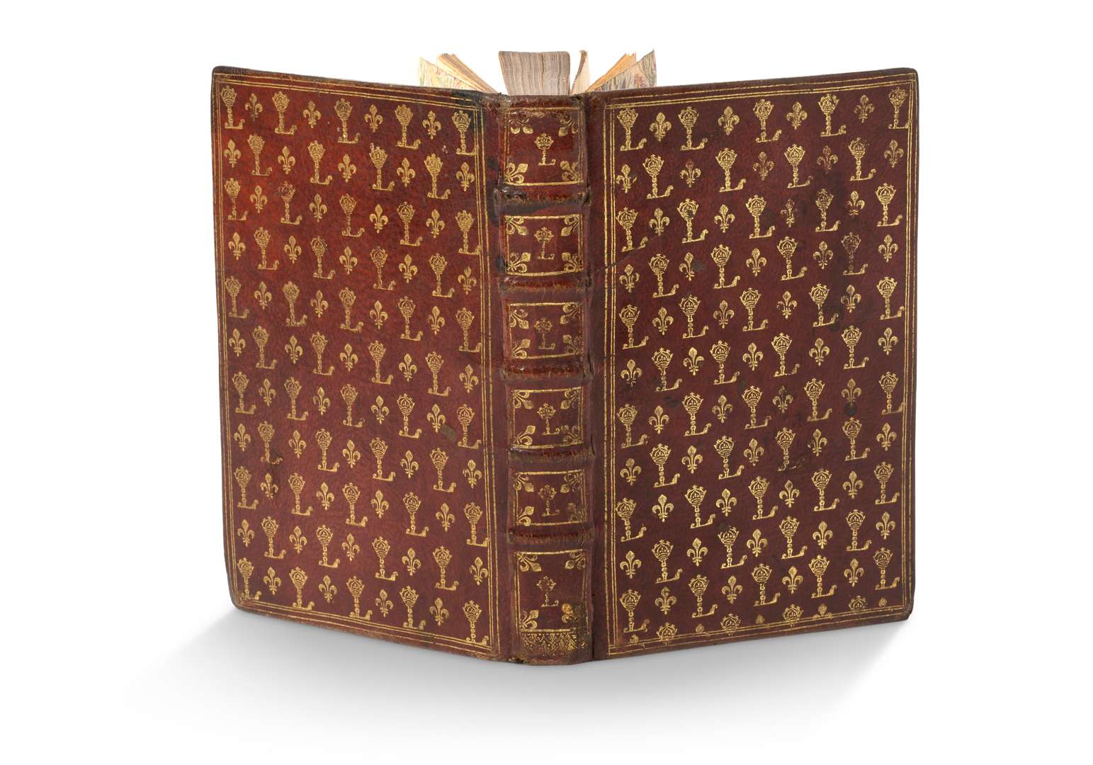 Nouvelle édition corrigée & augmentée. A Paris, Charles Fosset, [s.d. - vers 1660]. In-8, 4 ff. (dont une page titre gravé aux armes roi en prière et rameaux signée “chez Landry”), 512 pp., texte réglé en rouge. Maroquin rouge de l’époque semis de L et fleurs-de-lys dorés, dos à 5 nerfs, triple filet doré en encadrement sur les plats, roulette dorée sur les coupes, tranches dorées. Ouvrage illustré de 2 figures à pleine page, la première signée “chez Landry” et la seconde par M. Le Febvre. Taches au papier. Salissures aux plat sup. et petite restauration au plat inf. coins frottés.