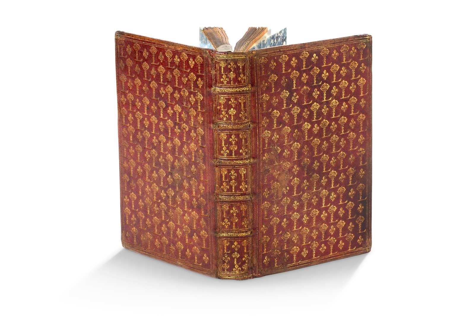 A Paris, Claude Le Groult (in fine), 1661. Petit in-8, titre gravé aux armes roi en prière, 468 pp., texte en rouge et noir réglé. Maroquin rouge de l'époque aux armes de Louis XIII, dos à 5 faux nerfs orné, semis de L couronnés et fleurs-de-lys dorés aux caissons et plats, triple filet doré en encadrement sur les plats, roulette dorée sur les coupes, tranches dorées. Illustré de 3 figures à pleine pages gravées sur cuivre par P. Bertrand. Exemplaire reliée chez Antoine Ruette, “relieur ord. du Roy… avec privilège du Roy 1661.” Feuillets très légèrement brunis, petits défauts marginaux sur certaines pages.
