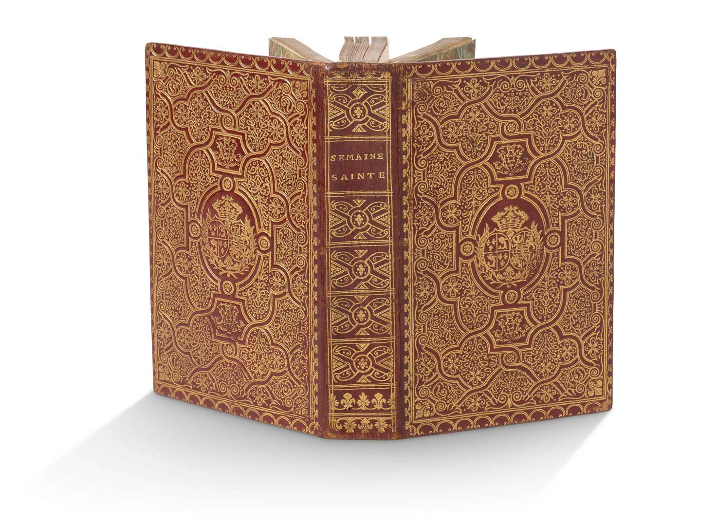 Maroquin rouge de l'époque, dos lisse orné, plats entièrement recouverts d’ornement doré aux petits fers, fleurs de lys en écoinçons, armes frappées au centre, roulette dorée sur les coiffes, coupes et chasses, tranches dorées.