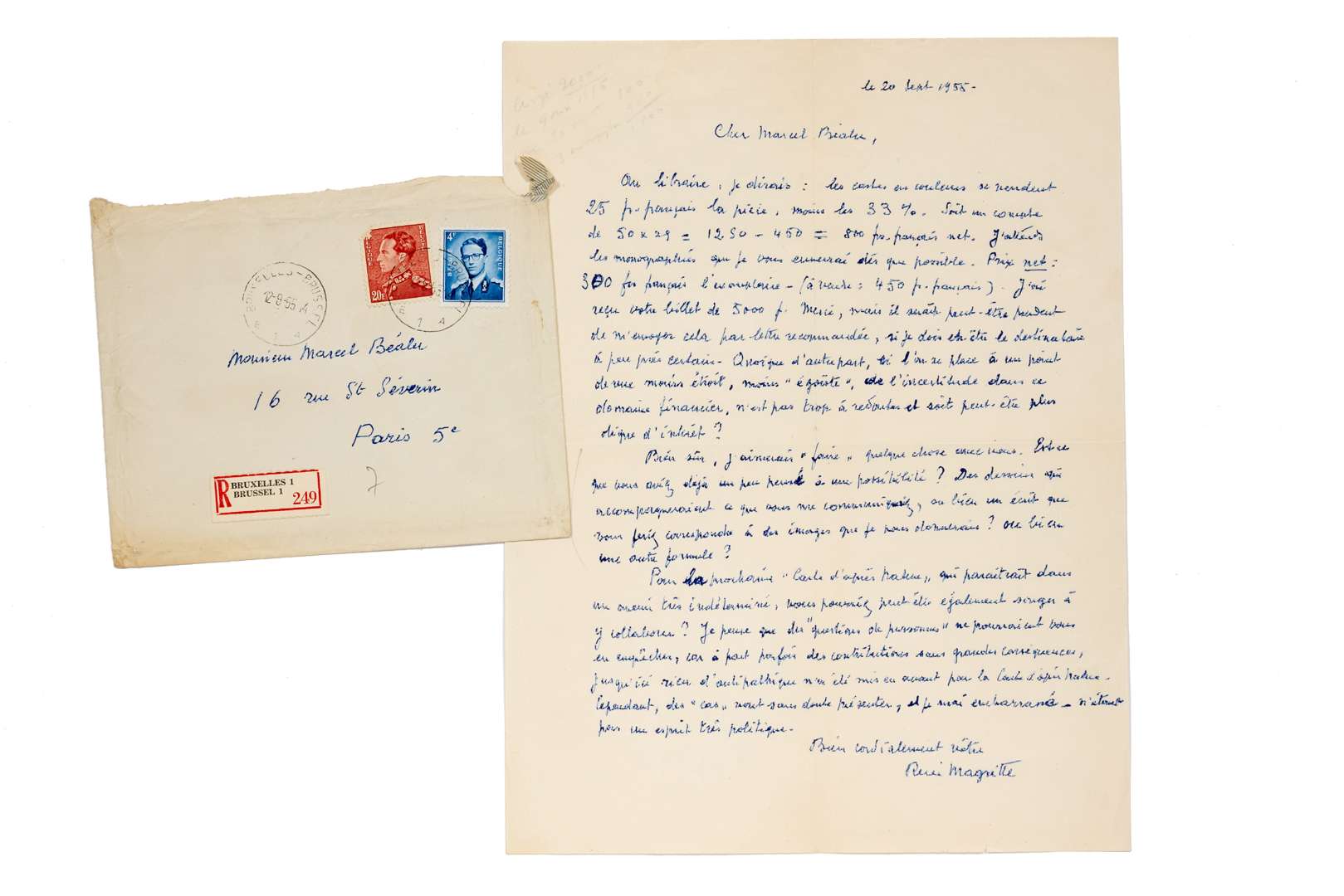 L.A.S. « René Magritte », Bruxelles 20 septembre 1955, à Marcel BÉALU ; 1 page in-4, enveloppe timbrée.