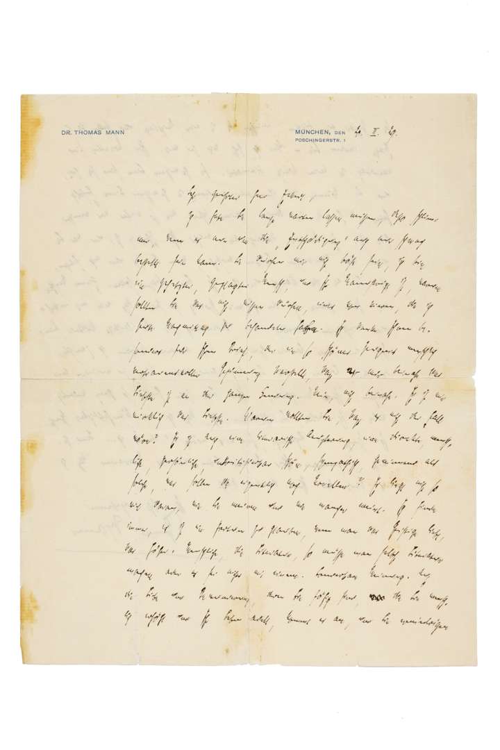 L.A.S. « Thomas Mann », München 20 février 1929, à Herr ECKARDT ; 2 pages in-4 à son en-tête Dr. Thomas Mann et adresse (plis fendus et réparés, lég. taches sur un bord) ; en allemand.