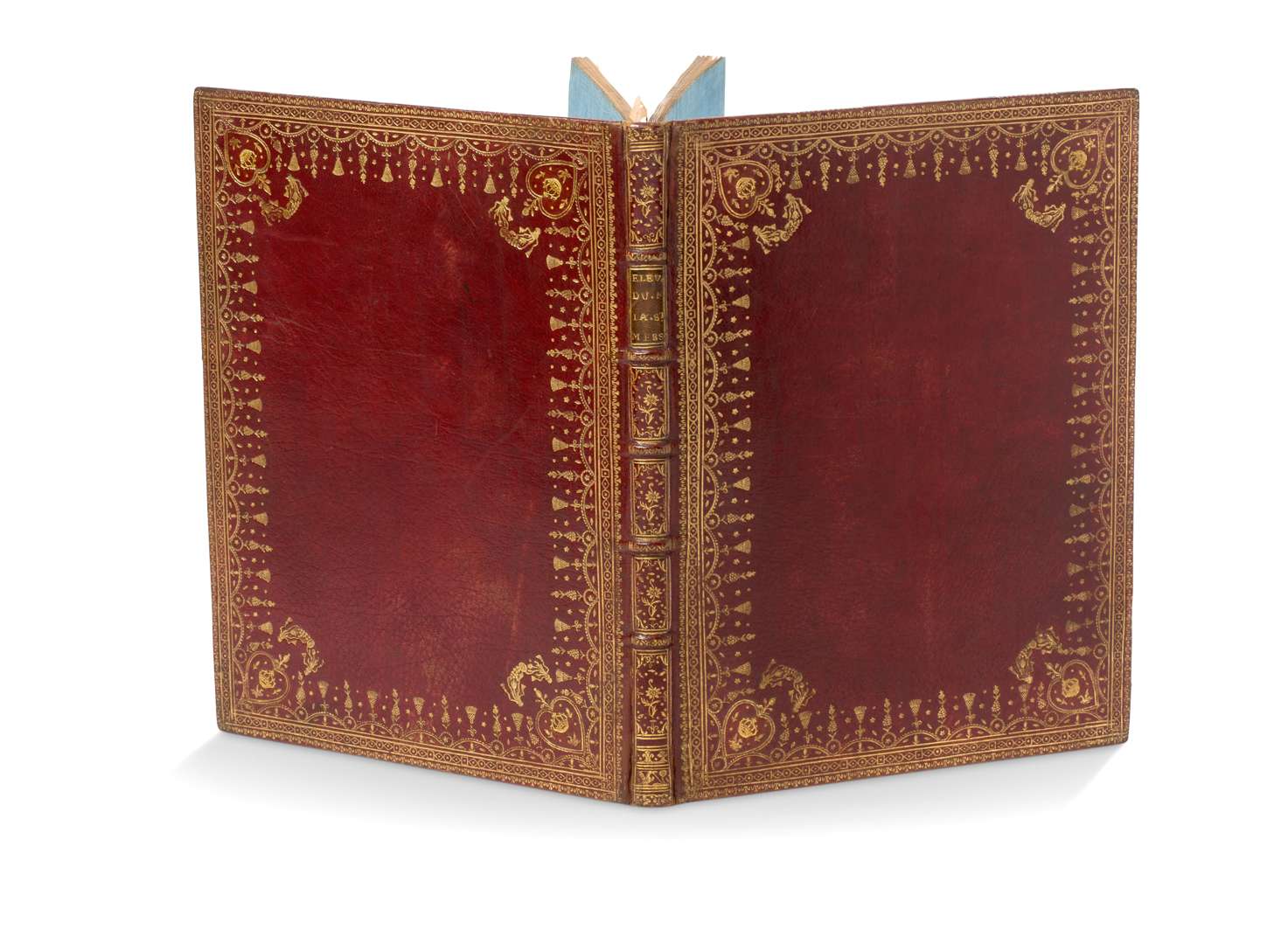 Maroquin rouge de l’époque, large dentelle à petits fers alternant pampilles, végétaux et roulettes dorées en encadrement sur les plats, fers dorés de cœurs renfermant la couronne de France en écoinçons, dos à nerfs orné, pièce de titre de maroquin olive, titre doré, guirlande aux contreplats, roulette dorée sur les plats, gardes de tabis de soie bleue, tranches marbrées et dorées.