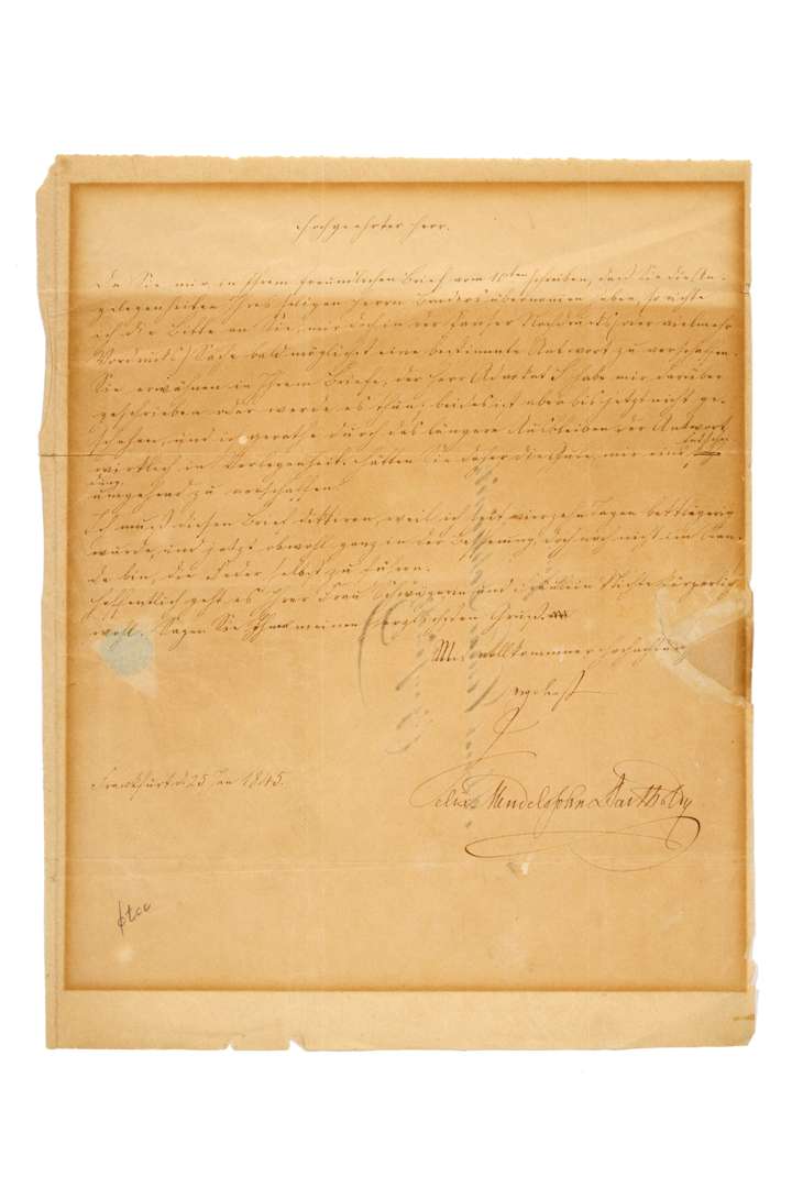 L.S. «Felix Mendelssohn Bartholdy », Frankfurt 25 janvier 1845, à l’avocat Conrad SCHLEINITZ ; 1 page in-4, adresse au dos (papier en partie bruni et insolé après encadrement, lég. fente à un pli, petite déchir. par bris du cachet réparée) ; en allemand.