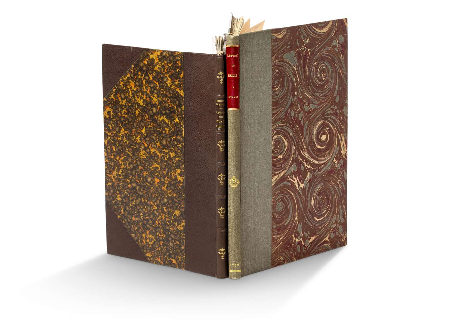 Lettres de Dulis à son ami. 1776. Réunion de 2 éditions de Lettres de Dulis par Mercier, une édition originale et une illustrée en sanguine. -MERCIER, Louis-Sébastien. Lettres de Dulis à son ami. A Londres et se trouve a Paris, chez la Veuve Duchesne, 1776. In-8, 34 pp. Illustration à pleine page et cul-de-lampe en sanguine gravé d'après G. de S. Aubin (dernière feuille restaurée dans la marge latérale). -MERCIER, Louis-Sébastien. Lettres de Dulis à son ami. A Londres et se trouve à Paris, chez Le Jay, 1776. 1 planche gravée par De Longueil d'après J. M. Moreau, une en tête et un cul-de-lampe. (marge latérale de titre et dernière feuille courte).