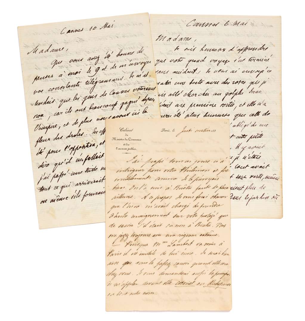 On joint 2 L.A.S. à la comtesse de BEAULAINCOURT, Cannes 6 et 10 mai [1870], sur un envoi de roses et la situation politique, et sur le succès du plébiscite (4 p. in-8 chaque).