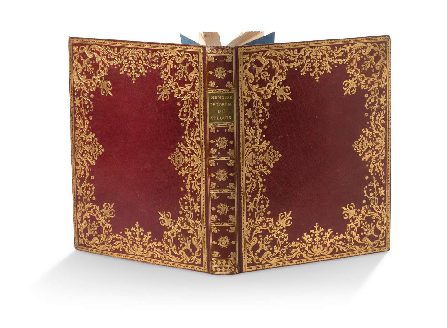 Maroquin rouge rocaille à grande plaque dorée sur les plats, dos lisse orné d'un fer répété à la croix de l'Ordre, pièce de titre maroquin vert au titre doré, double filet doré sur les coiffes et coupes, roulette dorée sur les contreplats, tranches dorées, gardes de papier marbré bleu.