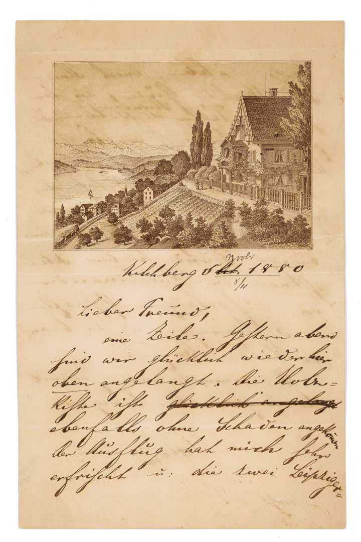 L.A.S. « Ihr M », Kilchberg 5 novembre 1880, à son ami Hermann HAESSEL ; 2 pages in-8, grande vignette lithographiée avec vue du lac de Zurich ; en allemand.