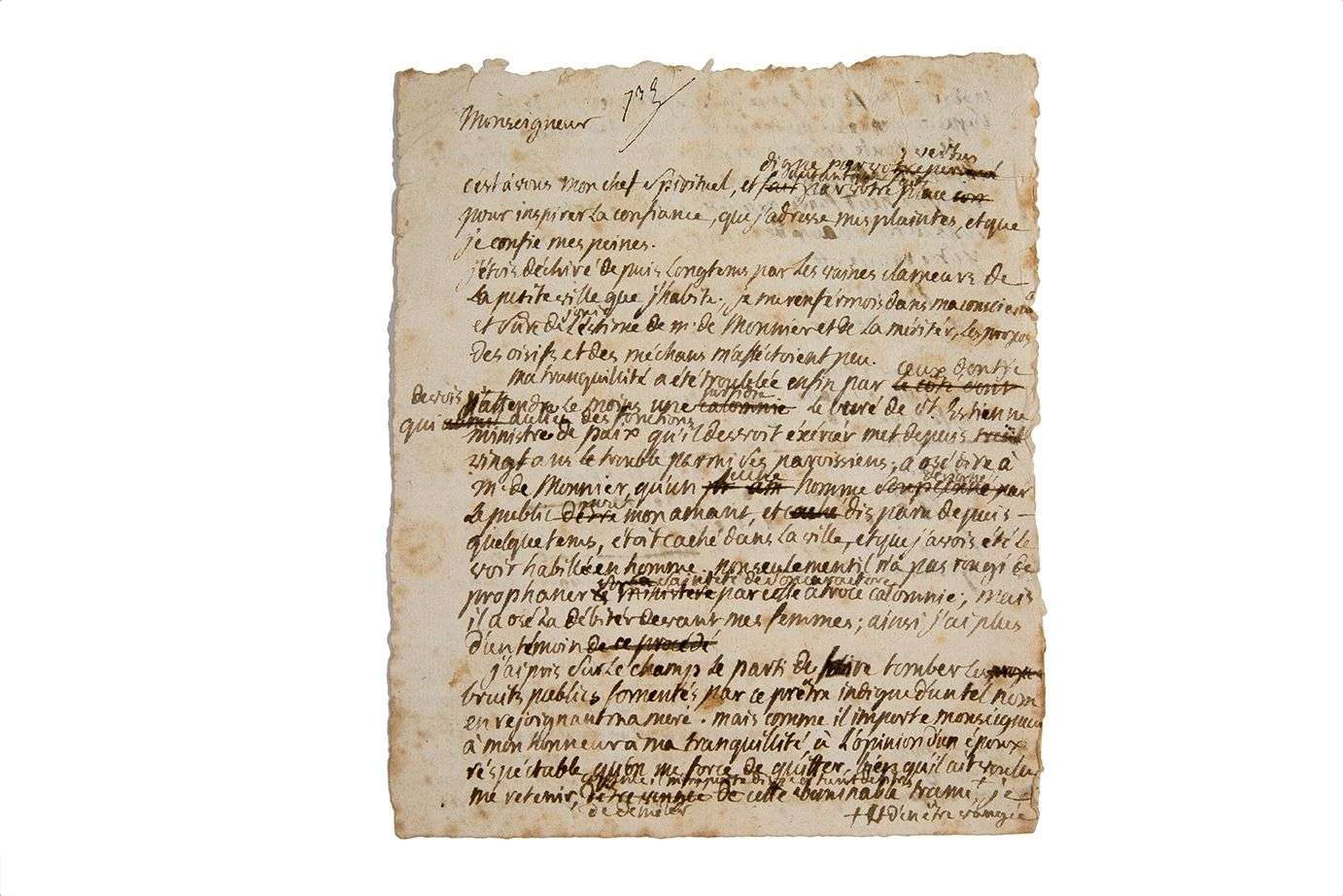 Brouillon de Mirabeau pour Sophie Monnier, où elle se défend des calomnies divulguées à son sujet par le curé de Pontarlier.