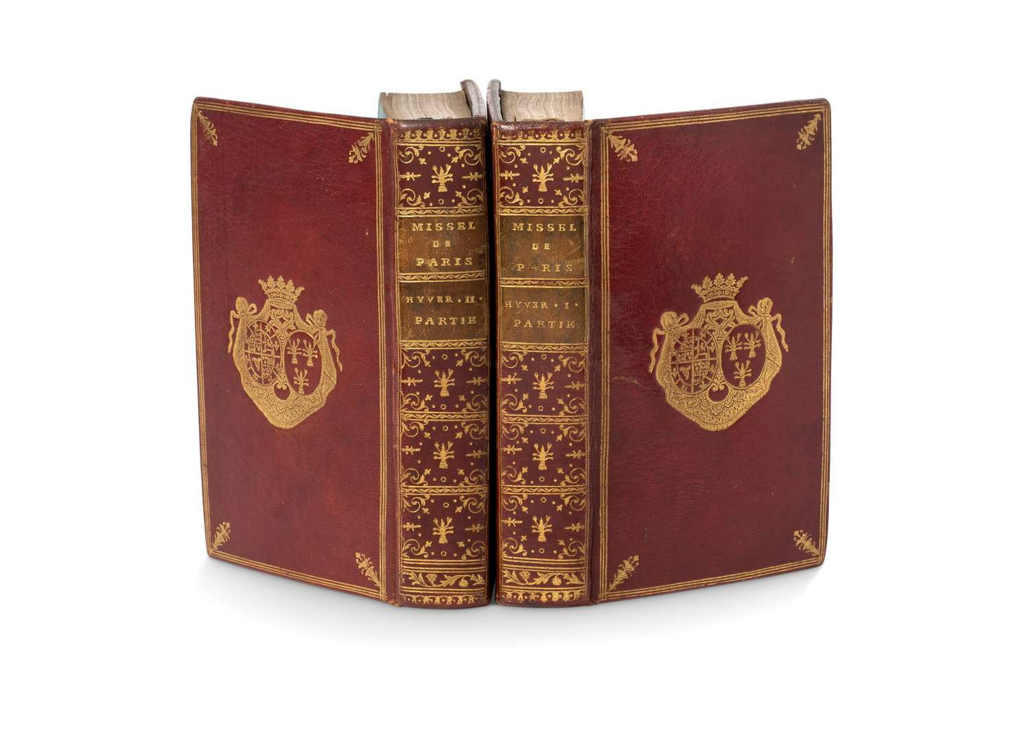 Maroquin rouge de l’époque, dos lisse, caissons ornés au petit fer doré à l’écrevisse répété, pièces de titre et tomaison de maroquin vert, titre doré, armes dorées poussées au centre des plats, filet doré sur les coupes, roulette dorée sur les contreplats, gardes de soie tabis bleue.