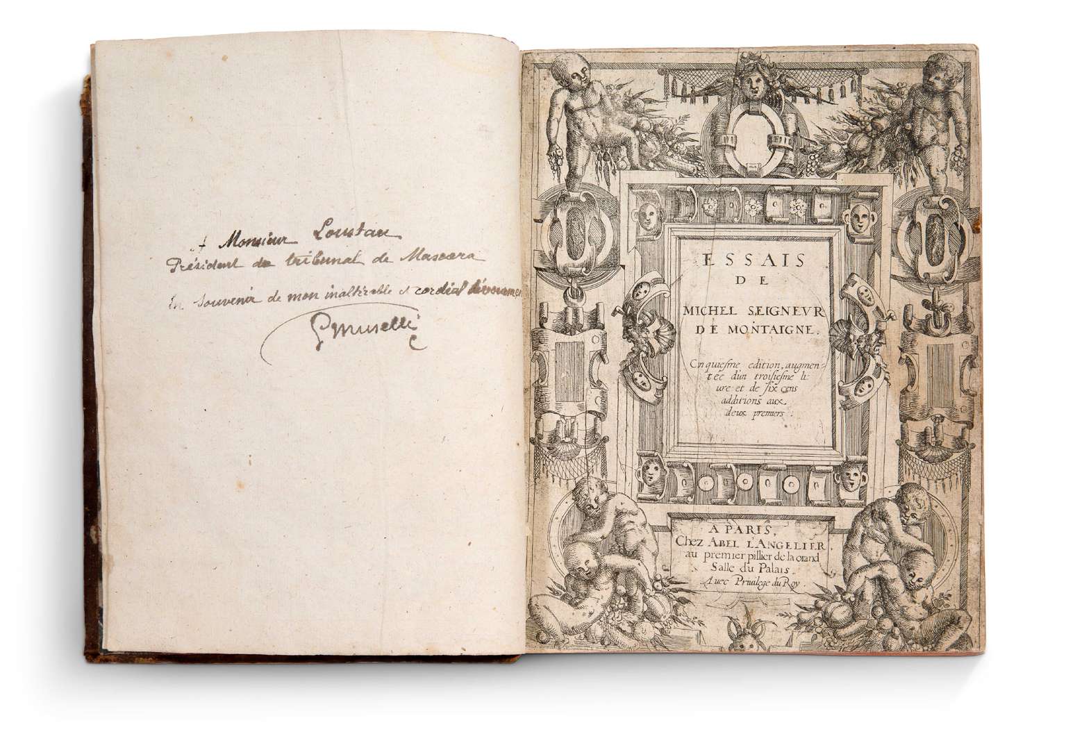 Essais de Michel Seigneur de Montaigne. Cinquième édition augmentée d’un troisième livre et de six cens additions aux deux premiers. A Paris, chez Abel l’Angelier, (1588). [4]- 504 ff mal chiffré 496. Au format fort in-4. Basane fauve marbrée du XVIIIe siècle, dos orné à 4 nerfs, pièce de titre doré, caissons fleuronnés ornés, tranches rouges, filet à froid en encadrement sur les plats, double filet doré sur les coupes. Précieux et très recherché. Princeps, en partie original pour le Troisième Livre, de la dernière édition des Essais, annotée et augmentée, publiée de son vivant par Montaigne. Le titre indique le 1er état : la date est absente et, grand, typographié « orand » dans l’adresse, ce qui sera corrigé au second tirage de l’édition. Malgré la mention au titre, cette édition est considérée comme la quatrième. Ce Cinquième au titre est encore inexpliqué aujourd’hui. « En 1588, les Essais font l’objet d’une nouvelle édition, entièrement revue et corrigée, augmentée du troisième Livre. (…) Aux deux premiers Livres, garants du succès originel de Montaigne, vint s’adjoindre une troisième pièce ; l’approche plus rigoureusement personnelle, plus intimiste de celle-ci devait assurer, mieux que tout, la pérennité des Essais ». En Français dans le texte, 73. Tchemerzine, IV, 873. Avec le très beau titre gravé en noir, dans le style du maniérisme bellifontain (cuirs découpés, enfants, coquilles, masques et guirlandes) alors en vogue, frontière entre grotesque et baroque, ici légèrement fatigué par l’usage et coupé court aux marges. Mais cet état se voit fréquemment, sa gravure étant plus grande que le livre elle est presque toujours un peu rognée sur les exemplaires connus. Provenance : Algérie Française. Ex dono à la plume de la première moitié du XXe, en regard du titre gravé. Exemplaire offert par P(ierre) Muselli à Paul Loustau alors président du tribunal de Mascara, ville berbère du NO algérien. Muselli était alors un érudit enseignant et notable, mécène, qui créa notamment une école de filles à son nom à Mascara. Les Loustau, famille d’Algérie française pour certaines de ses branches. Coiffes arasées, plats légèrement frottés, petites restaurations au plat supérieur, marges du titre gravé courtes, mouillures marginales, fente sans manque f. 129, f. 145 froissé, mors supérieur fragilisé en pied.
