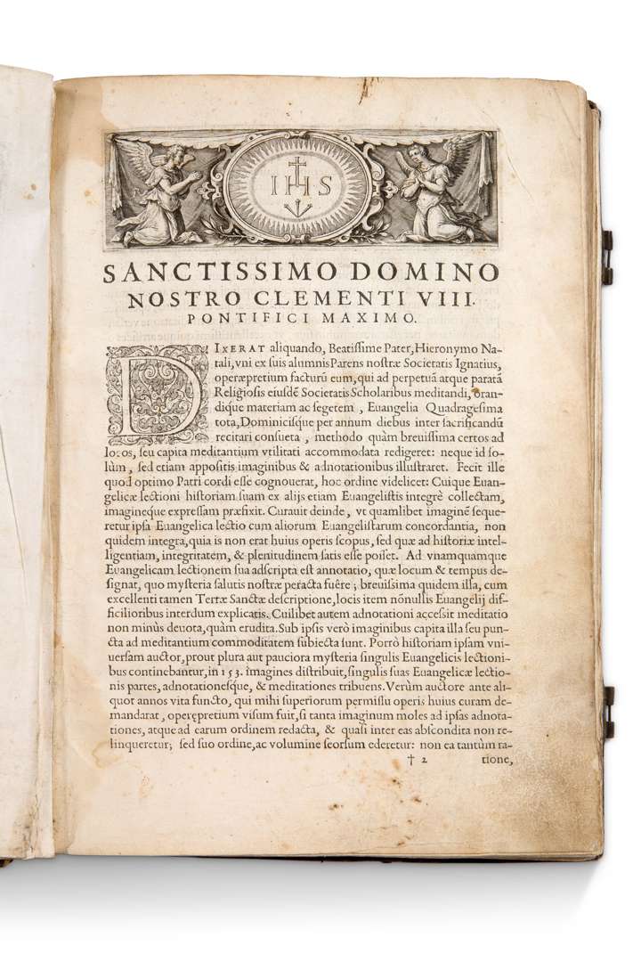 Evangelicae historiae imagines : ex ordine euangeliorum, quae toto anno in missae sacrificio recitantur, in ordinem temporis vitae Christi digestae… Antuerpiae (Anvers), 1593. [4] ff. (sur 5), 153 eaux-fortes en noir. Au format grand in-4. Basane taupe ornée à froid du XVIe siècle, dos à 4 nerfs, plats ornés de motifs géométriques formés par des guirlandes à froid dans le gout de l’époque, 1 fermoir métallique ancien. Exemplaire sur vergé de la très belle première édition des Evangiles de Natalis avec sa suite gravée en taille-douce. « l’une des plus belles séries de gravures du XVIe siècle flamand», selon Pierre Berès. « Les effets de foule, les profondeurs des champs, la profusion des détails, significatifs sans nuire à l’ensemble, l’éclairage enfin, tout concourt à faire de ces gravures des chefs-d’œuvre ». Complet de sa suite des somptueuses estampes en noir illustrant les Évangiles. L’illustration se compose d’une page de titre gravée en noir, datée de 1593, avec un Christ en gloire, suivie de 152 planches au burin aux noirs profonds, signées dans l’image (pour le tirage de cette première édition). Estampes réalisées par certains des meilleurs graveurs flamands, dont les frères Wierix d'Anvers, Jan II et Adriaen Collaert, Charles de Mallery, d'après les œuvres du peintre italien Bernardo Passari pour la plupart, Maarten de Vos pour qques unes. Cette célèbre suite sur la vie du Christ est rapidement devenue une œuvre capitale pour les missionnaires jésuites et un chef-d'œuvre de la gravure flamande de la fin du XVIe siècle. “Beauté des épreuves”, Backer et Sommervogel, Bibliothèque de la Cie de Jesus, II, 1482 et V, 1518). Brunet, IV, 18. JÉSUITISME. GRAVEURS FLAMANDS. ORAISON. Coiffe supérieure restaurée, petits trous de vers au dos, coins légèrement émoussés, un fermoir manquant, discrètes rousseurs, trous de vers marginaux sur qques cahiers mais sans atteinte aux images, une mouillure latérale sur qques cahiers, quelques petites restaurations marginales, un accroc sans manque à la pl.15, pl. 145 froissée. Des disparités de papier aux planches 128-131, 133-134, 137-139 et 145-153.