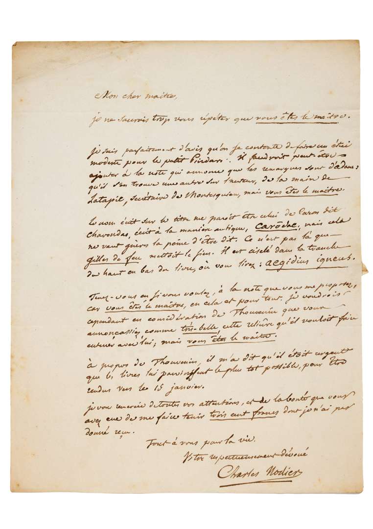 L.A.S. « Charles Nodier », [automne 1829], au libraire Jacques-Simon MERLIN ; 1 page in-4, adresse.