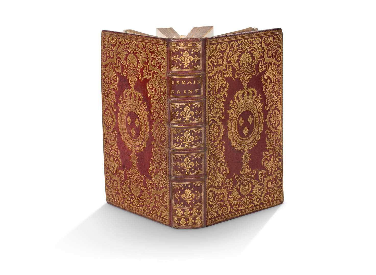 Figures gravées en noir par Humblot et Scotin J.B., bandeaux de bois gravés à l’Office du Dimanche des Rameaux, au Jeudi Saint, au Vendredi Saint et Office des Pasques.