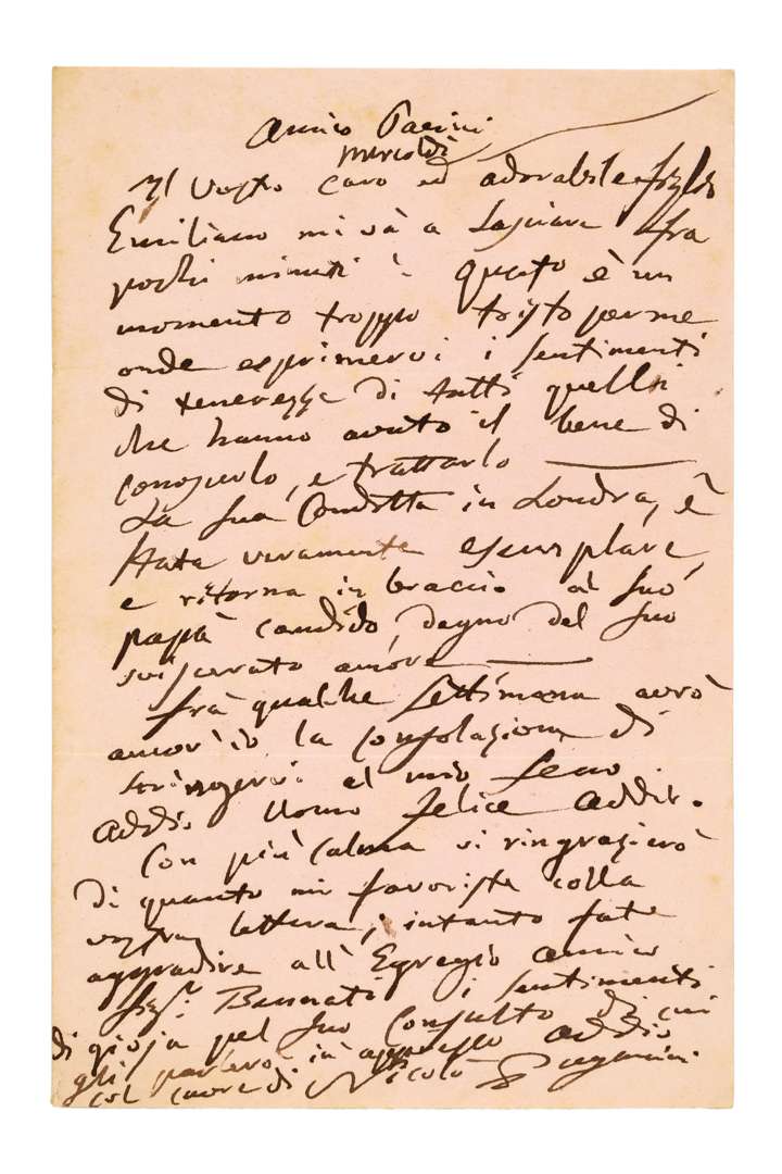 Affectueuse lettre adressée à son ami Pacini, dans laquelle il lui dit combien il regrette le départ de son cher fils de Londres