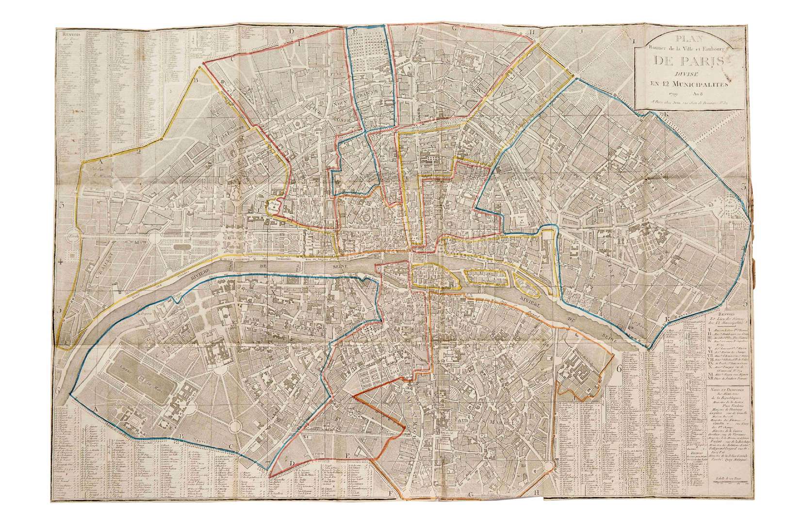 Plan Routier de la Ville et Faubourg de Paris divisé en 12 municipalités. Paris, chez Jean, 1799-An 8. In-folio dépliant (56 x 80 cm). Feuille entoilée en 21 sections, limites des municipalités définies par une mise en couleurs de l’époque. Plié, sous couverture cartonnée de papier marbré de l’époque, étiquette de titre manuscrite, annotations manuscrites de trajets et voyages en Ile-de France datées de 1826 sur les gardes. Plan quadrillé du Paris post-révolutionnaire et de ses environs, avec des listes permettant de repérer de nombreux lieux ; dans un des cartouches la liste des 12 municipalités avec l'emplacement de leurs sièges et celle des " Noms et demeures des ministres de la République”. Boutier, 364, C. Désolidarisé du cartonnage de papier marbré, discrète déchirure sans manque au bord inférieur, très légère usure d’usage des bords, anecdotiques rousseurs et petits trous au niveau de qques pliures (sans manque).
