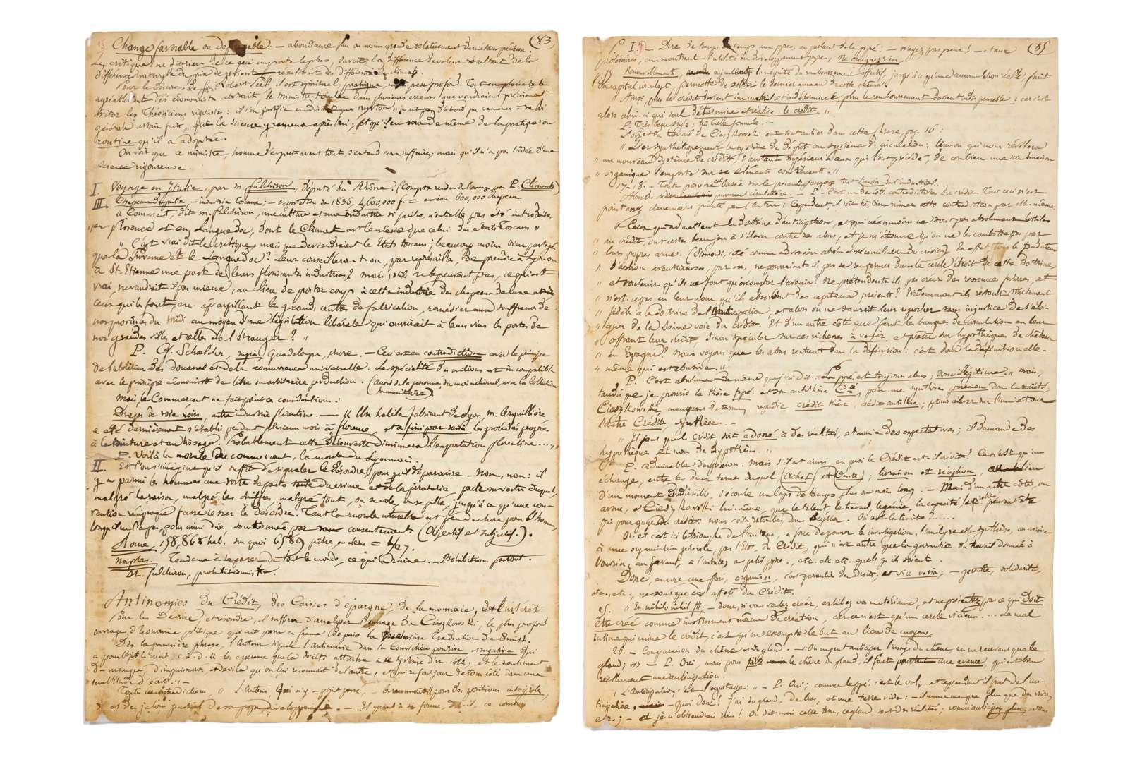 Notes de travail et documentation pour ses ouvrages d’économie politique, paginées par lui de 83 à 86, écrites à l’encre brune d’une écriture serrée remplissant les pages.
