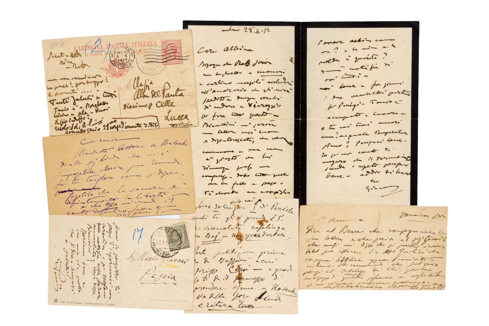 6 L.A.S. « Giacomo » ou « GPuccini » (une non signée), [1917-1924], à sa famille ; 7 pages in-8 ou in-12, dont 4 cartes postales avec adresse ; en italien. Correspondance familiale à sa mère, son frère et ses nièces.
