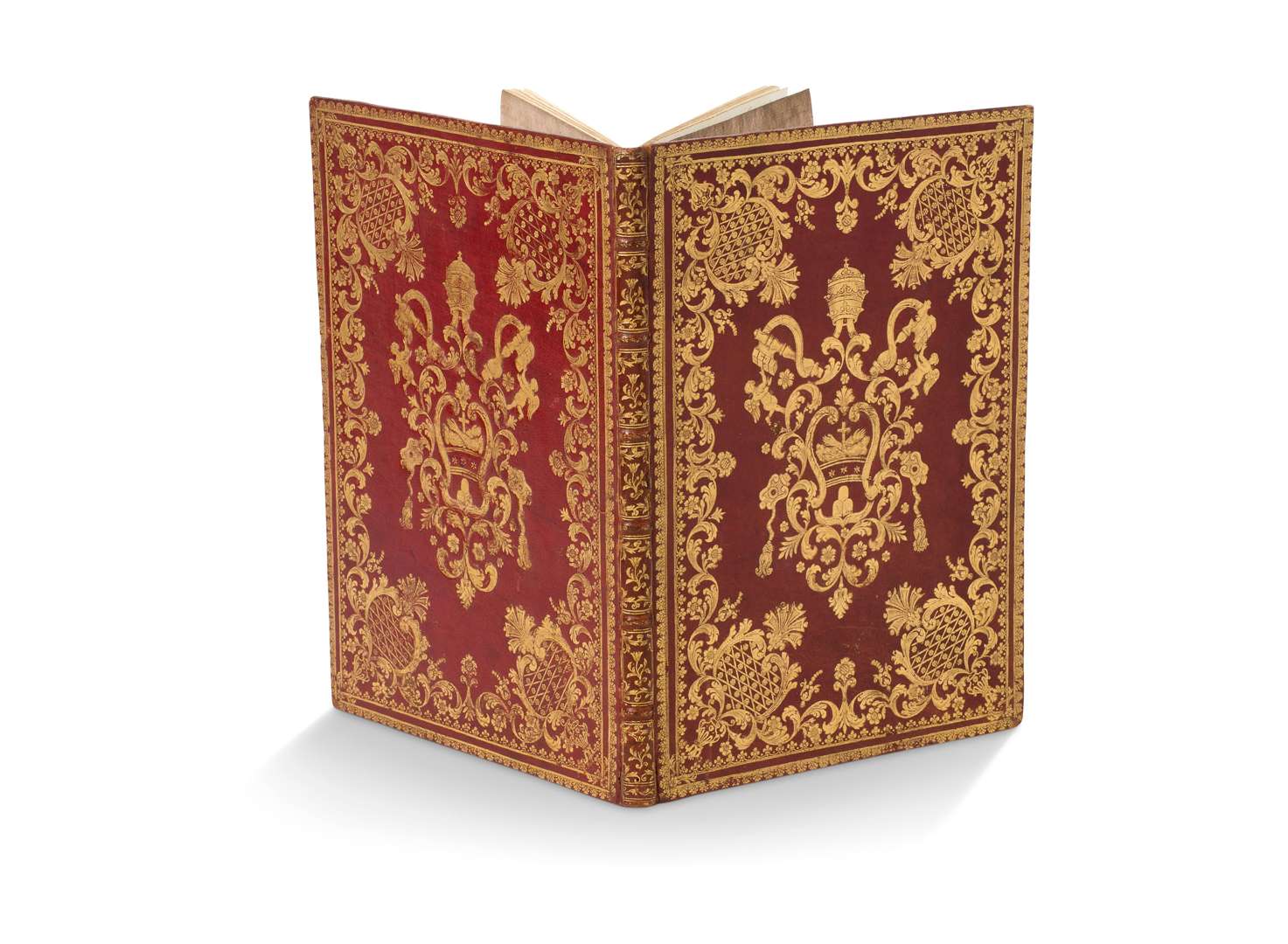Plats ornés en encadrement d’une grande plaque dorée à volutes et palmettes soulignée d’une guirlande dorée, grand fer doré aux armes avec tiare papale et clés (Saint-Siège) sur son blason le tout orné de fleurons et volutes, poussé au centre des plats, dos à nerfs orné de caissons fleuronnés dorés, très belles gardes de papier dominoté entièrement dorées-cuivrées.