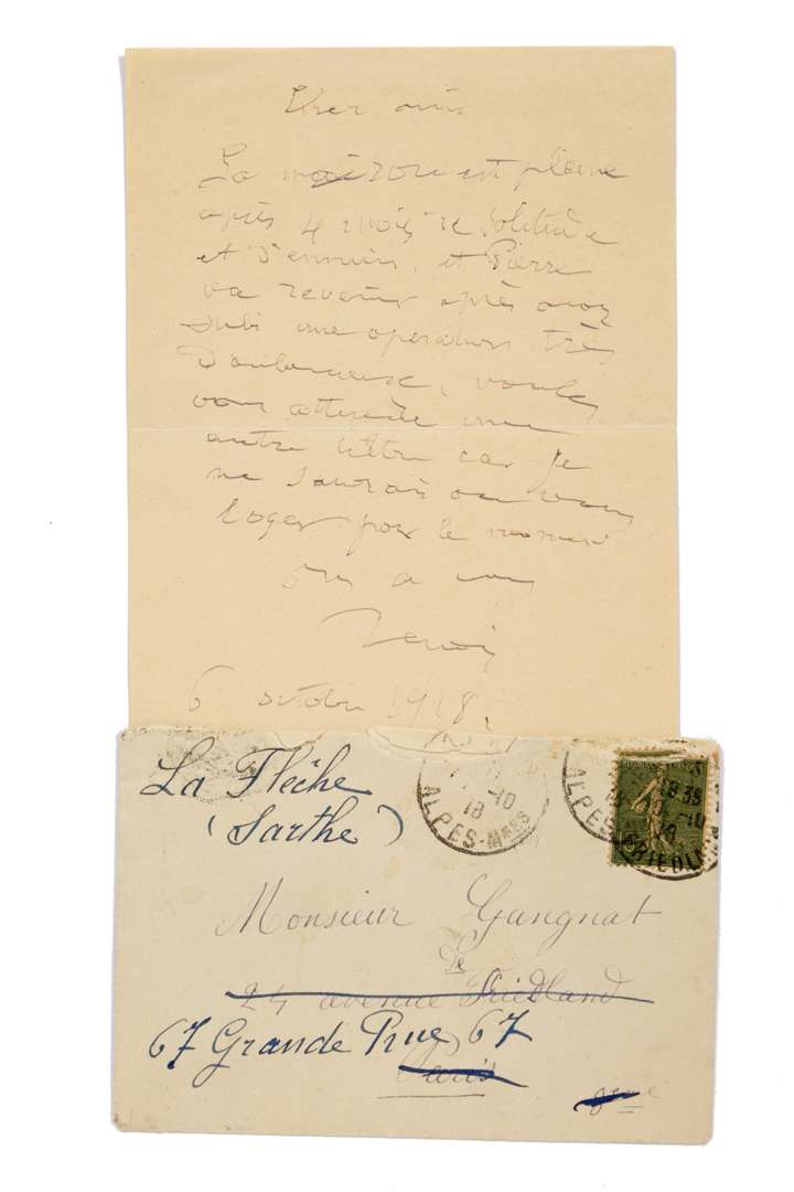 L.A.S. « Renoir », [Cagnes-sur-Mer] 6 octobre 1918, à son ami Maurice GANGNAT ; 1 page in-8, enveloppe timbrée.