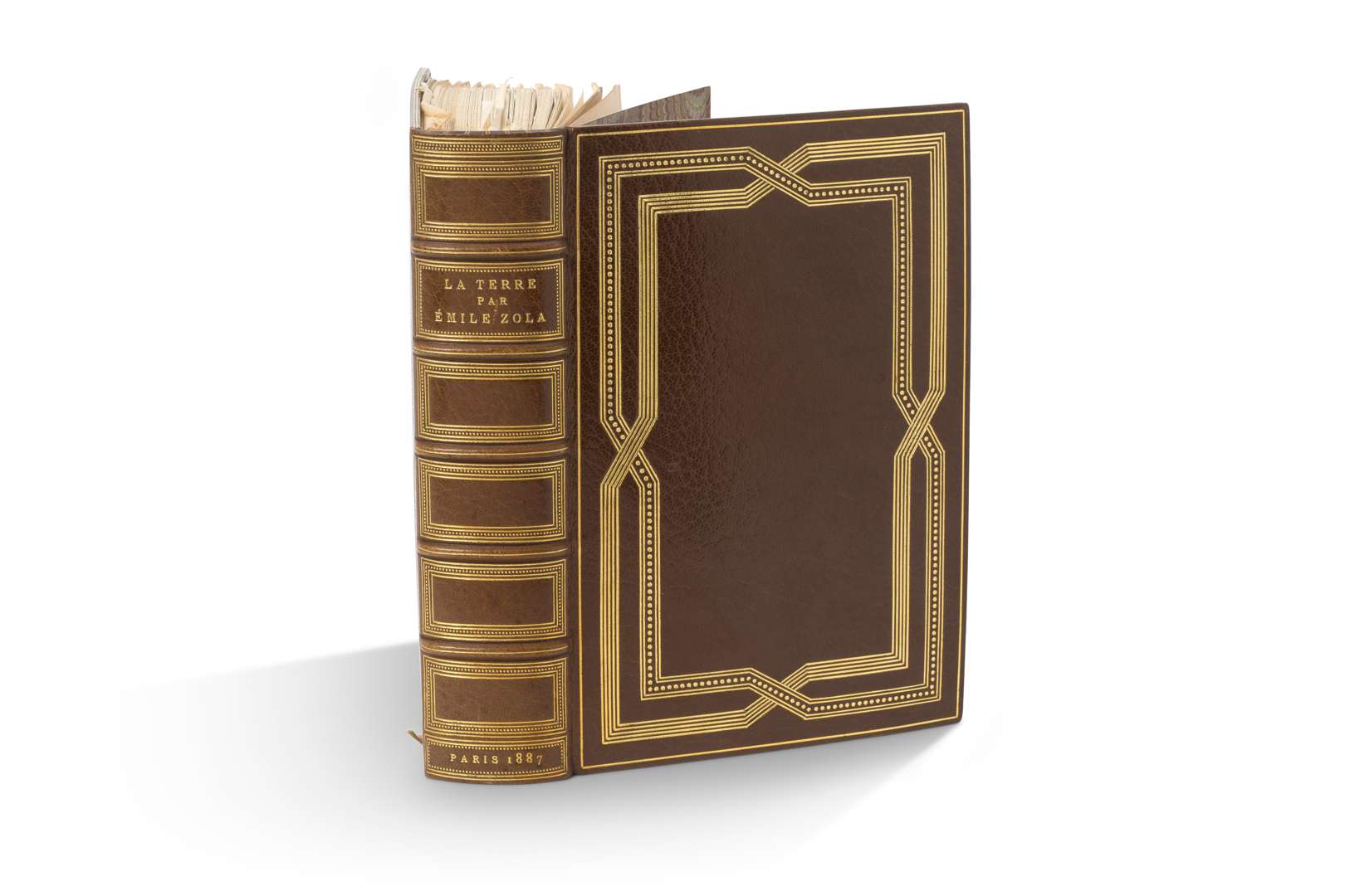 La Terre. Paris, G. Charpentier et Cie, 1887. In-12 (18 x 12 cm), [2] ff., 519 pp. Maroquin brun signé de l’époque, dos à 5 nerfs saillants, titre, auteur, lieu et date dorés, encadrement de multiple filets et points dorés aux caissons et plats, filets dorés aux coiffes, coupes et chasses, tranches dorées sur témoins, couverture conservée, sous étui marbré [Chambolle-Duru]. Exceptionnel exemplaire de l'édition originale de cet ouvrage d’Emile Zola illustré de 31 compositions aquarellées par Alcide Théophile Robaudi (1850-1928) toutes signées “A. Robaudi” ou avec ses initiales “A.R.” Avec un bel envoi de Zola : “Jean, ce matin-la, un semoir de / toile bleue noué sur le ventre, en te-/nait la poche ouverte de la main gau-/che, et de la droite, tous les trois pas, / il y prenait une poignée de blé, / que d’un geste, à la volée, il / jetait. / Emile Zola” Un des 275 exemplaires sur papier de Hollande, celui-ci n°. 39. Belle reliure signée de Chambolle-Duru.
