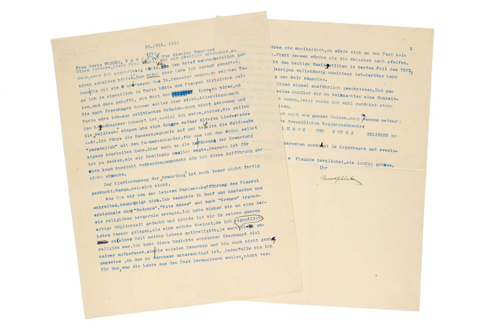 Intéressante lettre à la cantatrice Marya FREUND (1876–1966), relative au Pierrot Lunaire dont elle fut l’interprète inspirée.