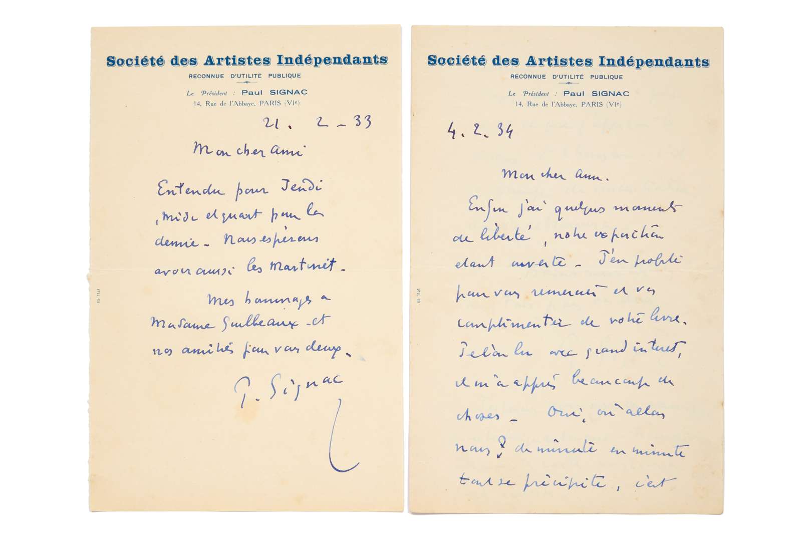 2 L.A.S. « Paul Signac », Paris 1933-1934, à Henri GUILBEAUX ; 1 et 2 pages in-8, à en-tête de la Société des Artistes Indépendants.
