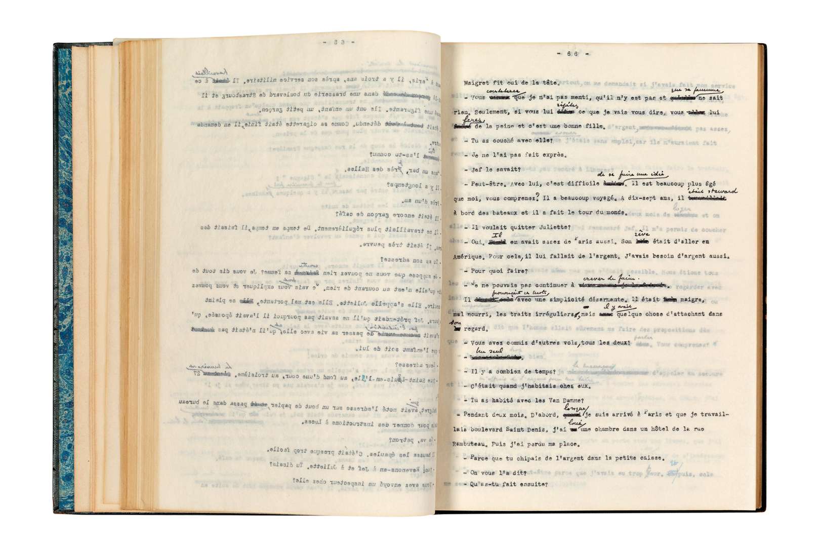TAPUSCRIT avec CORRECTIONS autographes,Maigret en meublé, 1941 ; 162 ff. in-4 à perforation marginale, reliure basane bleu roi, filets et triangle à froid en forme de f lèches sur les plats, dos titré or (charnières et dos un peu frottés), sous emboîtage de papier « serpent » lie de vin avec fenêtre et reproduction de la jaquette du roman, titre au dos (Thérèse Treille). Tapuscrit complet, très corrigé par l'auteur, de ce roman policier. Il est daté en fin « Shadow Rock Farm, Lakeville (Connecticut), 21 février 1951 », et signé par l'auteur.
