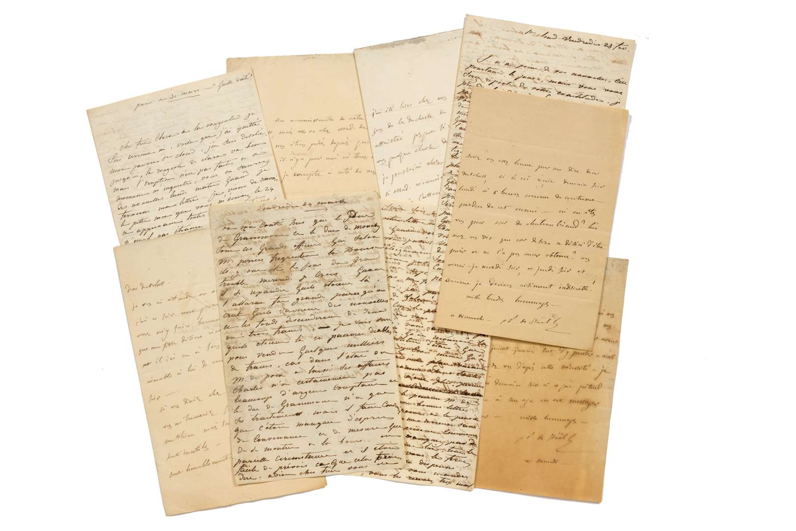 2 L.A.S. « N. de Staël » et 3 L.A., [automne 1814-début 1815], à la duchesse de DURAS ; 5 pages in-8, adresses dont une avec cachet de cire noireaux armes. Correspondance amicale. Provenance : La Duchesse de Duras et ses amis, Chateaubriand (vente 24 octobre 2013, n° 215). On joint 4 L.A. de la duchesse de DURAS à Chateaubriand.